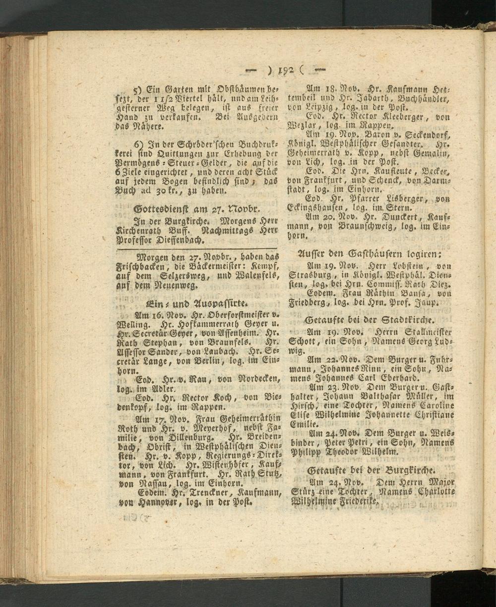 Am 17. Nov. Frau Geheimerratbin Roth und Hr. v. Meyerhof, nebst Familie, von Dillenburg. Hr. Breidenbach, Obrist, in Westphalischen Diensten. Hr. v. Kopp, Regierungs-Direktor, von Lich. Hr. Wistenhöfer, Kaufmann , von Frankfurt. Hr. Rath Stutz, von Nassau, log. im Einhorn.