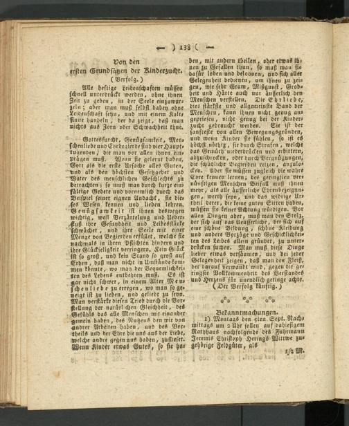 Gottesfurcht, Genügsamkeit, Menschenliebe und Ehrbegierde sind vier Haupttugenden, die man vor allen ihnen ein- prägen muß. Wenn sie gelernt haben, Gott als die erste Ursache alles Guten, Und als den höchsten Gesetzgeber und Vater des menschlichen Geschlechts zu betrachten ; so muß man durch kurze einfältige Gebete und vornemlich durch das Beispiel seiner eignen Andacht, sie dieses Wesen kennen und lieben lehren. Genügsamkeit ist ihnen deswegen wichtig, weil Verzärtelung und Ueber- siuß ihre Gesundheit und Leibesstärke schwächet, und ihre Seele mit einer Menge von Begierden erfüllet, welche sie nachmals in ihren Pflichten hindern und ihre Glückseligkeit verringern. Kein Glück ist so groß, und kein Stand so groß auf Erden , daß man nicht in Umstände kom- Znen könnte, wo man der Bcguemlichkei- len des Lebens entbehren muß. Es ist zar nicht schwer, in einem Alter Mrusch e n l i e b e zu erregen , wo man so gezeigt ist zu lieben, und geliebt zu seyn. Man verstärke diesen Trieb durch die Vorstellung der natürl chen Gleichheit, des Gefühls das alle Menschen mit einander gemein haben, des Nutzens den wir von andrer Arbeiten haben, und des Vor- tbeil» und der Ehre die uns aus der Liebe, welche andre gegen uns haben, zuflieset. Wenn Kinder'elwgs Gutes, so sie ha