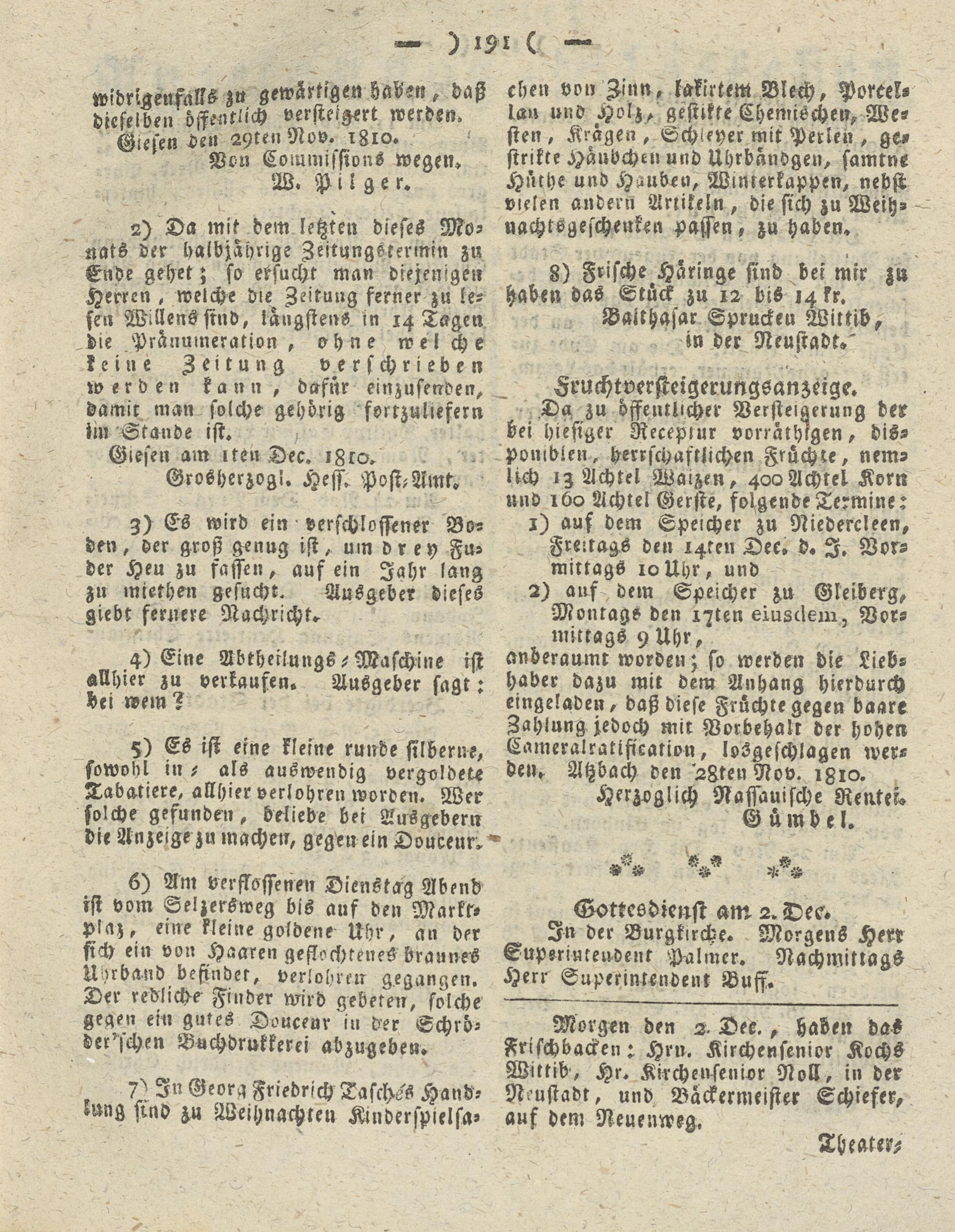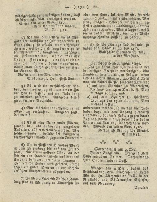 6) Am verstossenen Dienstag Abend ist vom Selzeröweg bis auf den Markt- plaz, eine kleine goldene Uhr, an der sich ein von Haaren geflochtenes braunes Uhrband besinder, verlohren gegangen. Der redliche Finder wird gebeten, solche gegen ein gutes Douceur in der Schrö- der'schen Buchdrukkerei abzugeben.