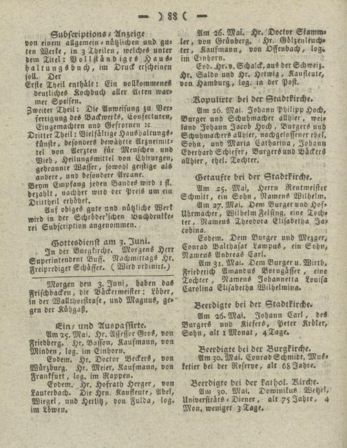 Eodem. Hr. Hofrath Herger, von Lauterbach. Die Hrn. Kaufleute, Abel, Wiegel, und Herlitz, von Fulda, log. im Löwen,