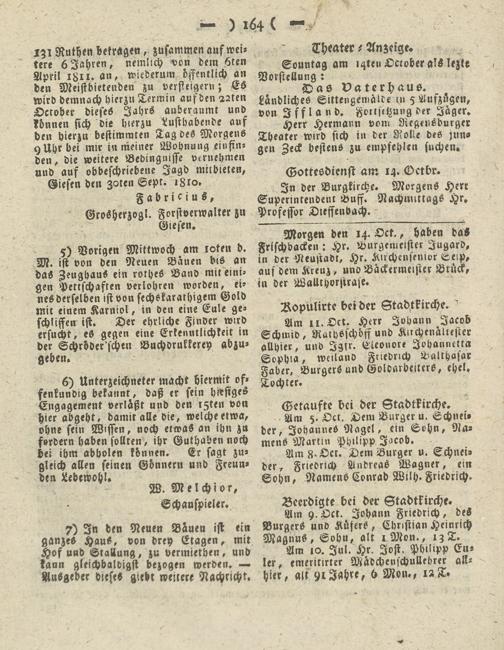 6) Unterzeichneter macht hiermit offenkundig bekannt, daß er sein hiesiges Engagement verläßt und den rzten von hier abgeht, damit alle die, welche etwa, ohne sein Wissen, noch etwas an ihn zu fordern haben sollten, ihr Guthaben noch der ihm abholen können. Er sagt zugleich allen seinen Gönnern und Freunden Lebewohl.