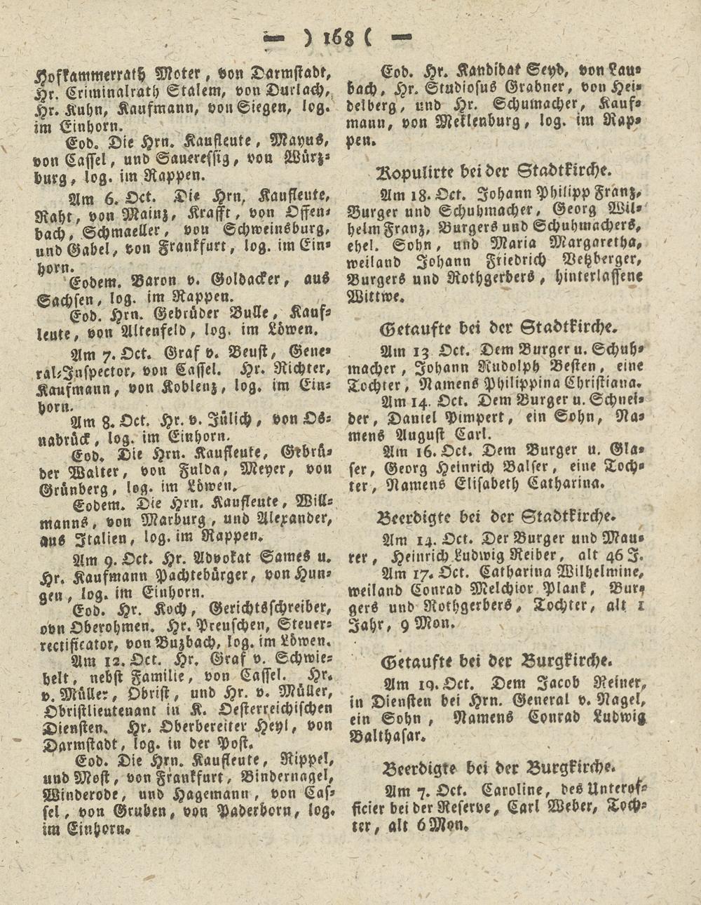 Am 6. Oct. Die Hrn, Kaufleute, Rahr, von Mainz, Krafft, von Offen« dach, Schmaeller, von Schweinsburg, und Gabel, von Frankfurt, log. im Einhorn. .