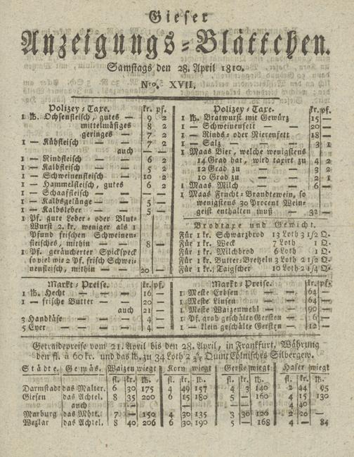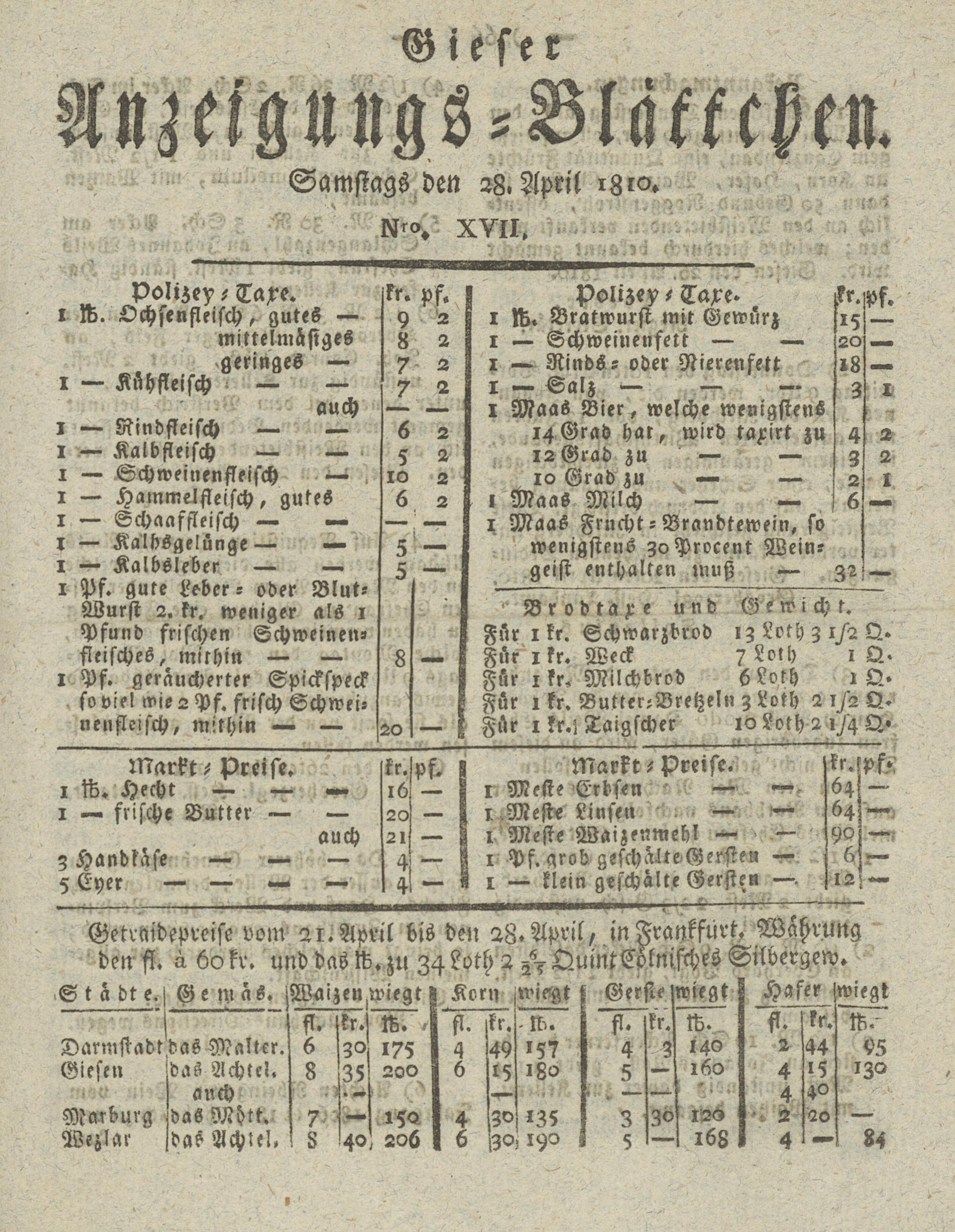 Getraidepreise vom 21.April bis den 28.April, in' den fl. ä 60 kr. und das ft. zu 34 Loth 2 A- QuintC-