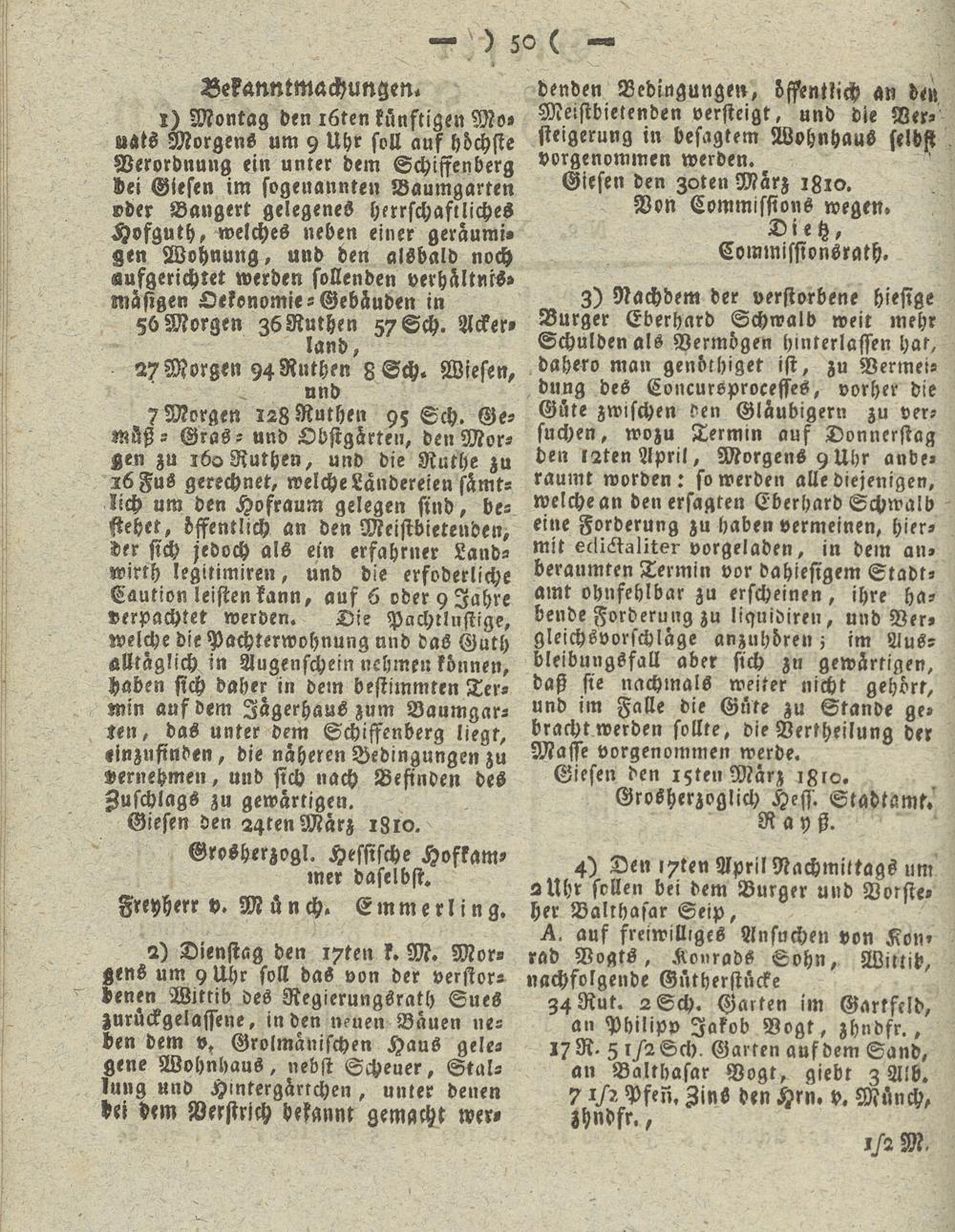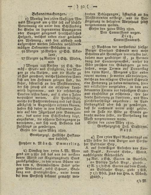 I) Montag den i6ten künftigen Mo» uats Morgens um 9 Uhr soll auf höchste Verordnung ein unter dem Schiffenberg Lei Giesen im sogenannten Baumgarten »der Bangert gelegenes herrschaftliches Hofguth, welches neben einer geräumigen Wohnung, und den alsbald noch aufgerichret werden sollenden Verhältnis- mäsigen Oekonomie-Gebäuden in