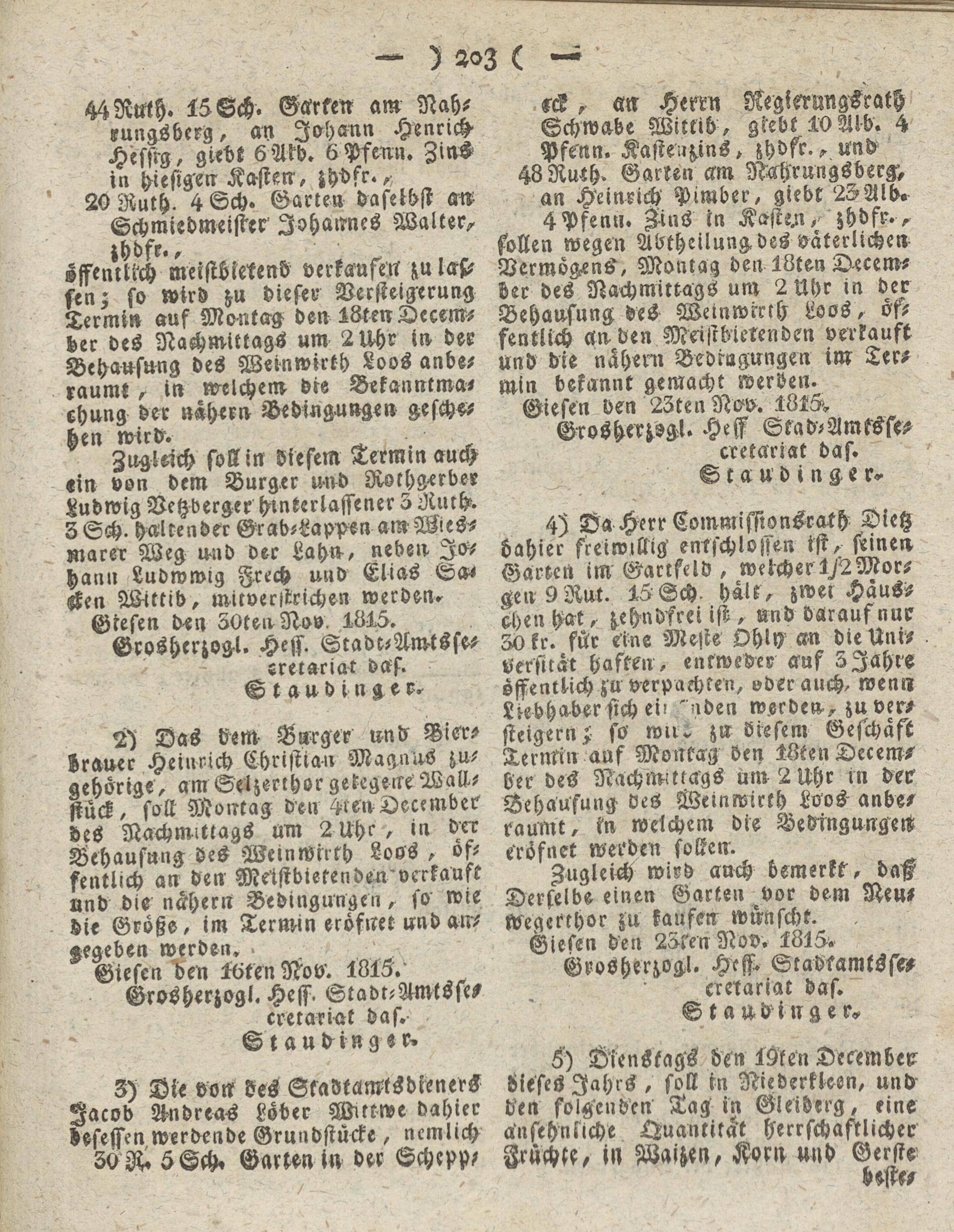 Giesen den 23tenNov. 1815, Grosherzsgl. Hess Stad-Amtsst- ccetariat das.