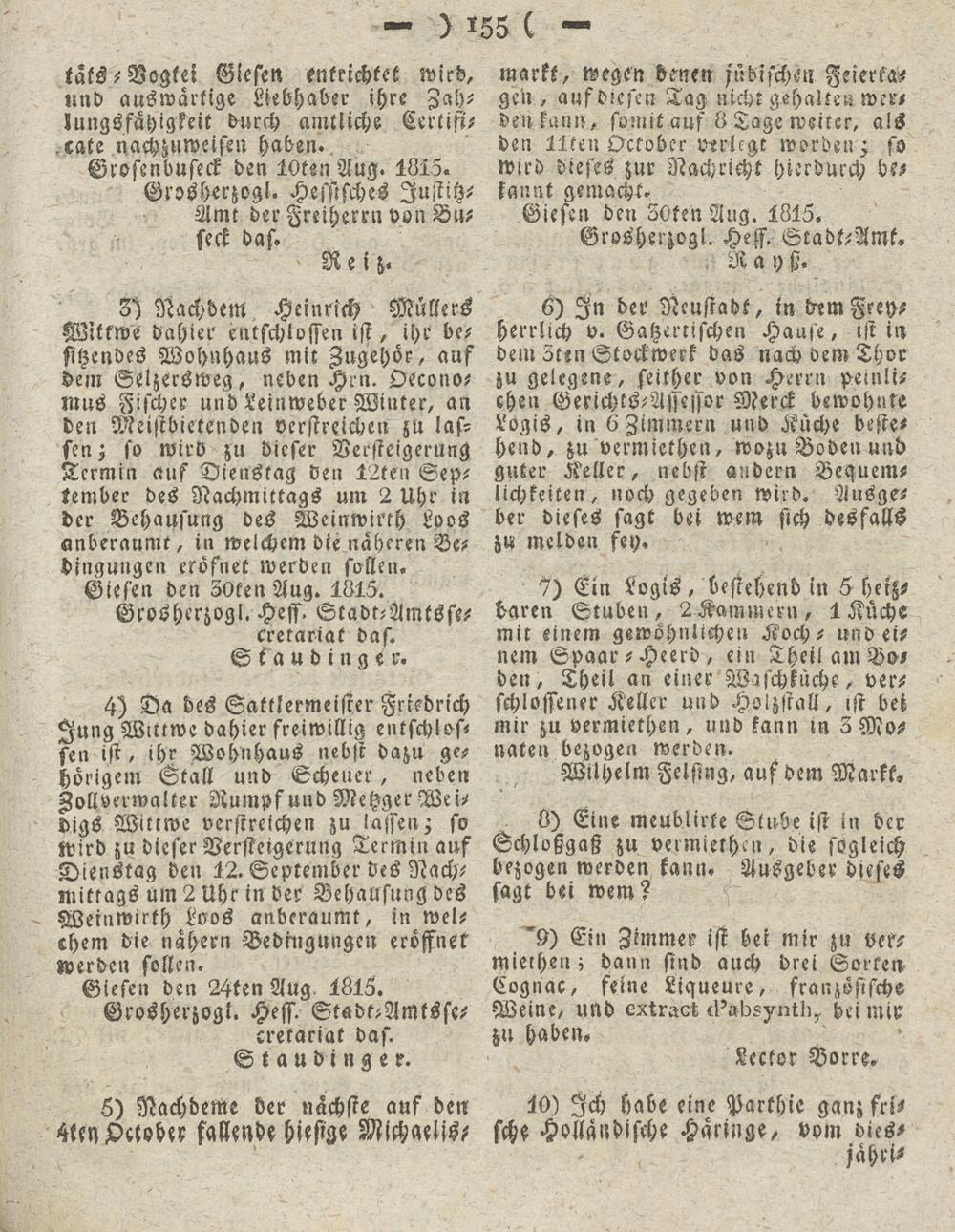 Giesen den ZOtenAug. 1815« Grosherzogl. Hess. Stadt-Amt, R a y fj.