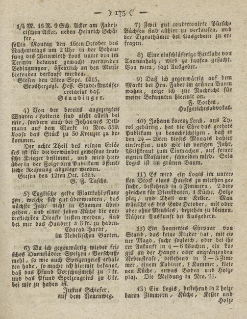 Der achte Theil des reinen Erlöses ist für die verwundet gewesene reut# fche Krieger bestimmt, und wird hierüber in der Folge dem Publikum öffentliche Rechnung abgelegt werden- Giesen den 12ten Oct. 1815.