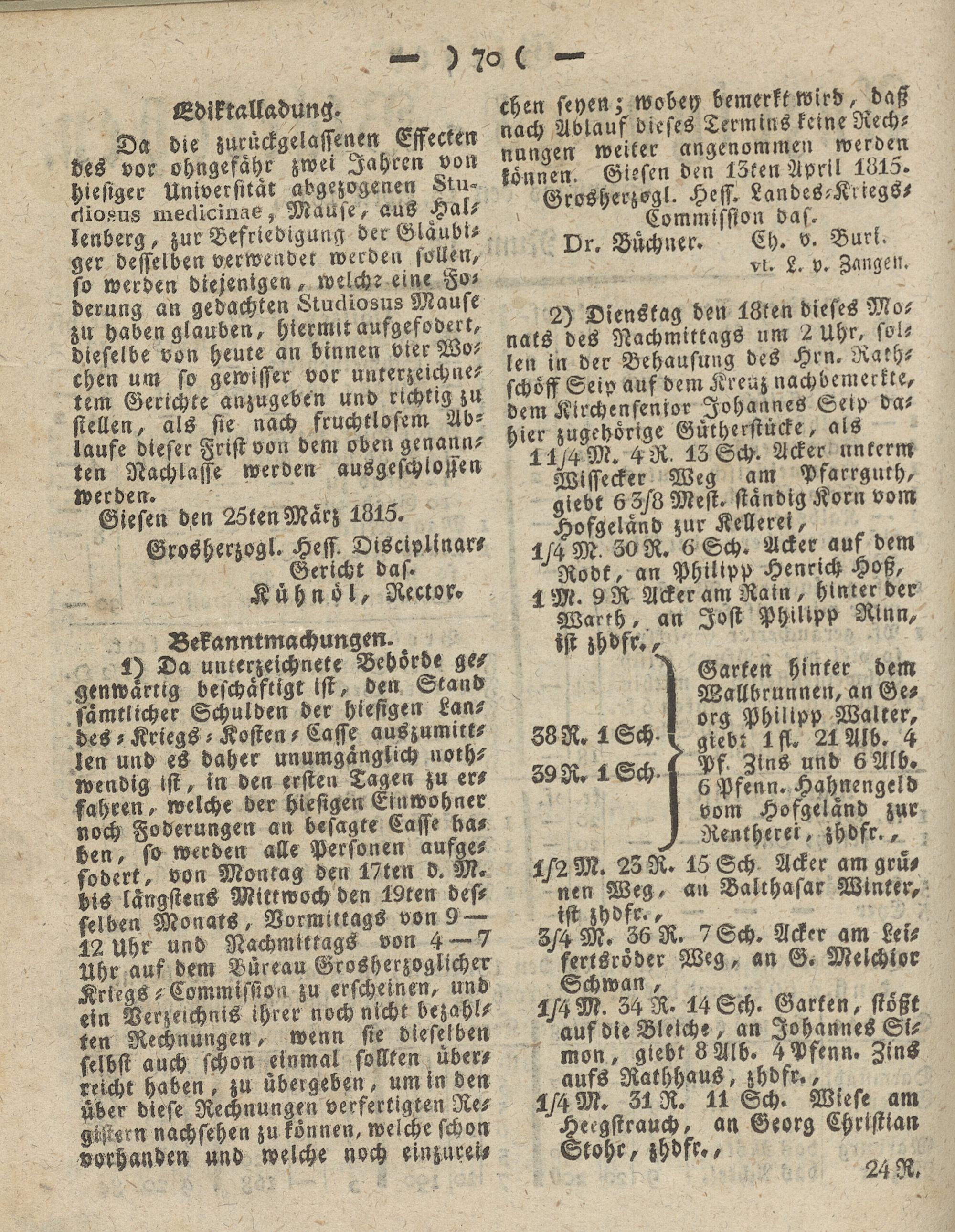 1) Da unterzeichnete Behörde ge- genwarktg beschäftigt ist, den Stand sämtlicher Schulden der hiesigen Landes - Kriegs - Kosten-Caffe auszumltt- len und es daher unumgänglich uoth- wendig ist, in den ersten Tagen zu erfahren, welche der hiesigen Einwohner noch Foderungen an besagte Caffe haben, so werden alle Personen aufge- fodert, von Montag den 17ten d. M- bis längstens Mittwoch den 19ten desselben Monats, Vormittags von 9 — 12 Uhr und Nachmittags von 4~-7 Ahr auf dem Büreau Grosherzoglicher Kriegs-Commission zu erscheinen, und ein Verzeichnis ihrer noch nicht bezahlten Rechnungen, wenn sie dieselben selbst auch schon einmal sollten überreicht haben, zu übergeben, um in den Über diese Rechnungen verfertigten Re- «iistern nachsehen zu können, welche schon vorhanden und welche noch einzurek