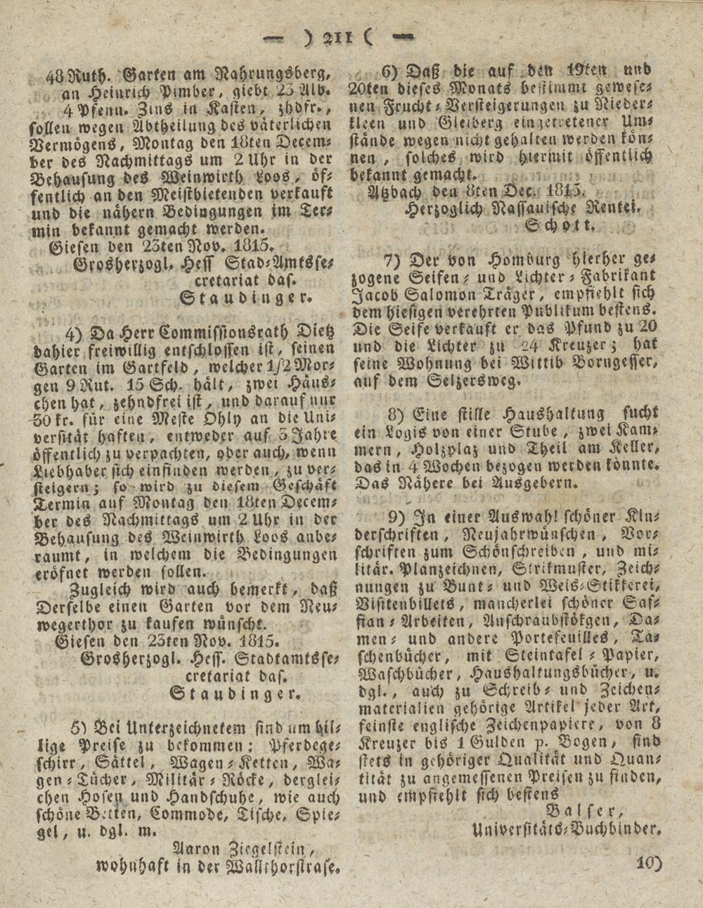 7) Oer von Homburg hierher gezogene Seifen - und Lichter-Fabrikant Jacob Salomon Trager, empfiehlt sich dem hiesigen verehrten Publikum bestens. Die Seife verkauft er bas Pfund zu 20 und die Lichter zu 24 Kreuzer; hat seine Wohnung bei Wittib Borngesser, auf dem Selzersweg.