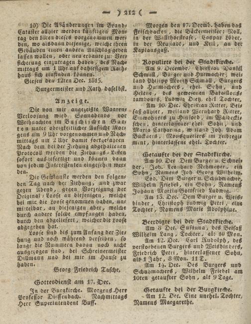 Am,9. Decemdr. Chi-istrai. Daniel Schmoll , Buiger und Hukmacher weiland Philipp Moritz Schwall , Burgers und Hulmachers, ehet. Sohn, und Helene, dos gewei-enen Batacklons- tambours, Ludwig Dietz, ehcl Tochter.