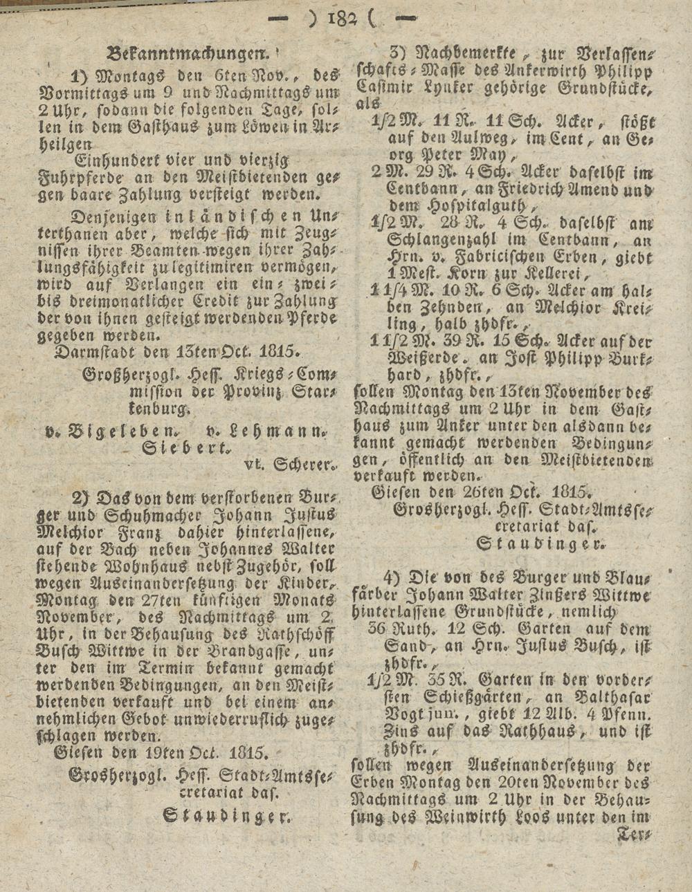 1) Montags den 6ten Nov°, des Vormittags um 9 undNachmiltags um 2 Uhr, sodann die folgenden Tage, sollen in dem Gasthaus zum Löwenin Ar- Heilgen