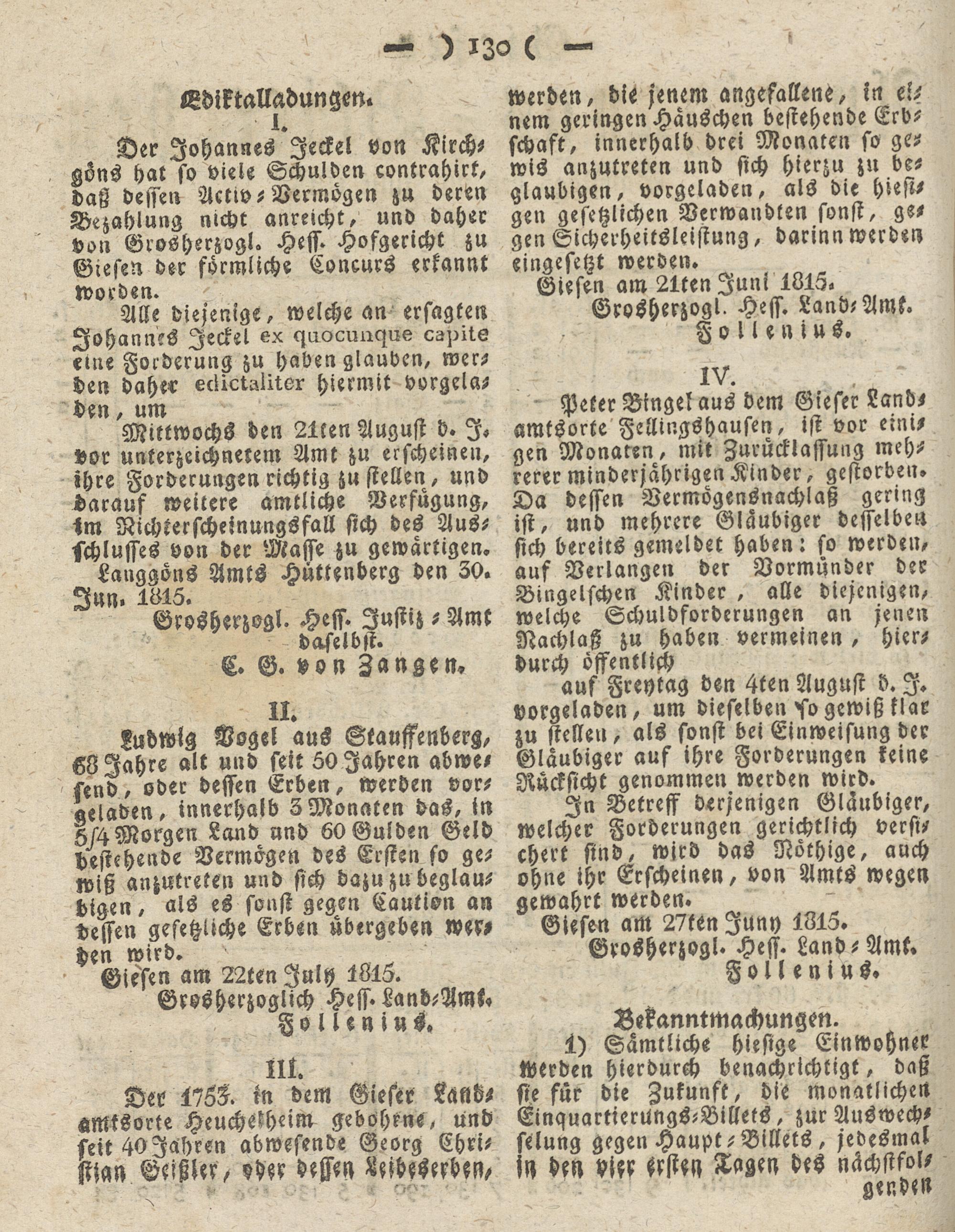 Peter Btngel aus dem Gieser Land- amtsorte Fellingshausen, ist vor einigen Monaten, mit Zurücklassung mehrerer minderjährigen Kinder, gestorben. Da dessen Vermögensnachlaß gering ist, und mehrere Gläubiger desselben sich bereits gemeldet haben: so werden, auf Verlangen der Vormünder der Bingelschen Kinder, alle diejenigen, welche Schuldforderungen an jenen Nachlaß zu haben vermeinen, hierdurch öffentlich