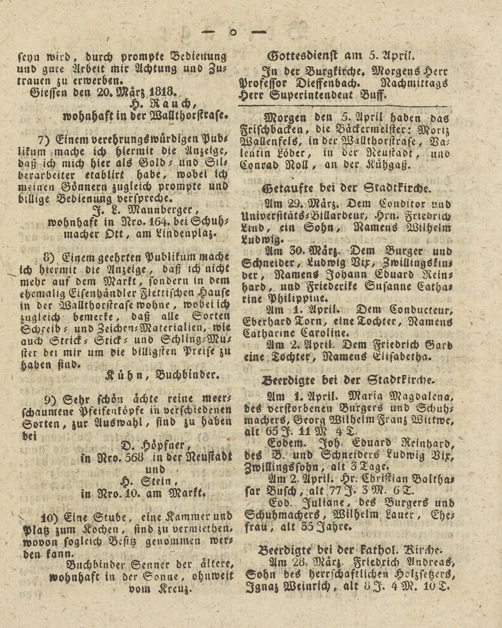 Am 29. März. Dem Condiror und Universitäts-Billardeur, Hrn. Friedrich Lind, ein Sohn, Namens Wilhelm Ludwig.