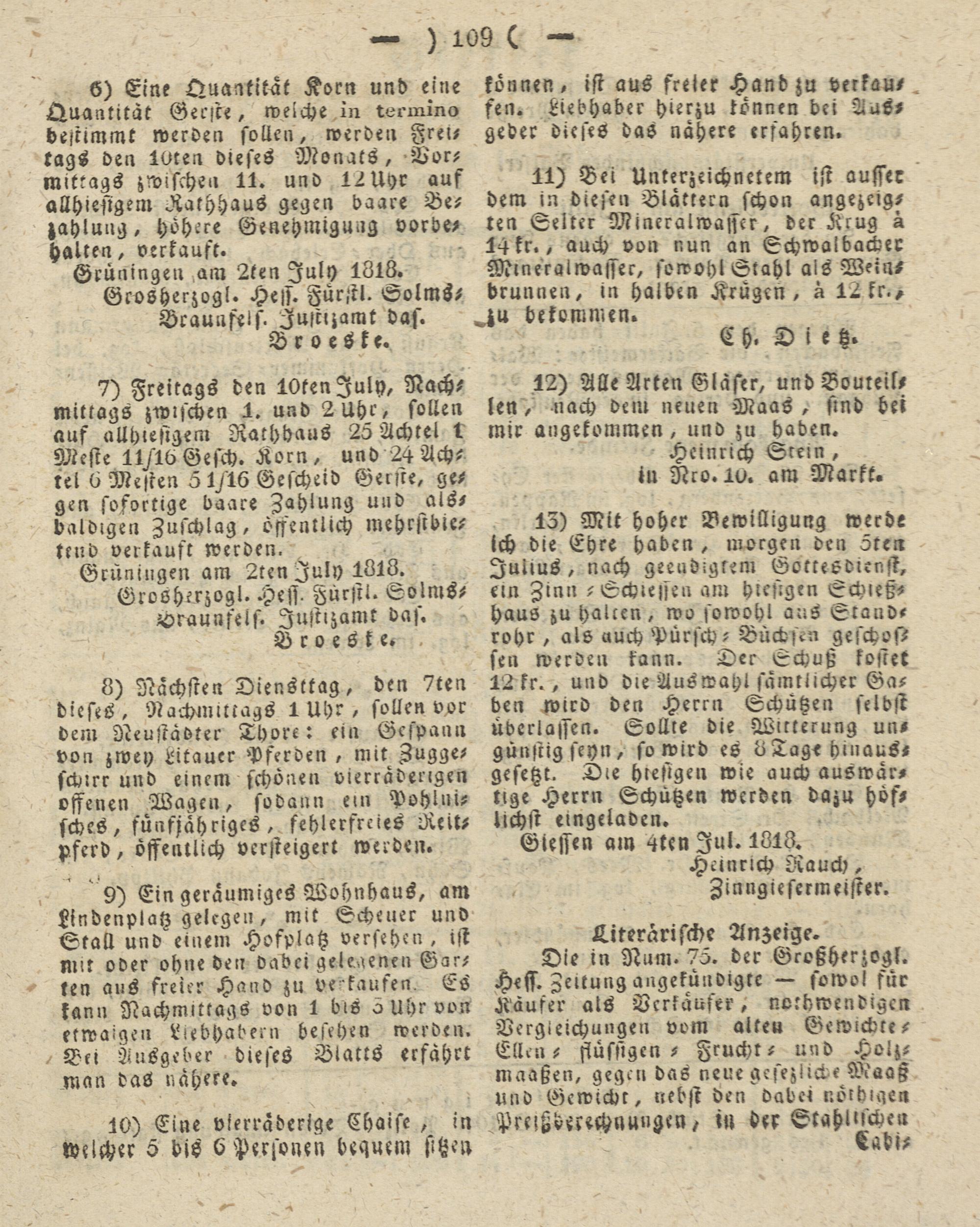 13) Mit hoher Bewilligung werde ich die Ehre Haden, morgen den 5ken Julius, nach geendigtem Gottesdienst, ein Zinn -Schreffen am hiesigen Schießhaus zu halten, wo sowohl aus Stand- rohr, als auch Pürsch- Büchsen geschossen werden kann. Der Schuß kostet 12 fr., und die Auswahl sämtlicher Gaben wird den Herrn Schützen selbst überlassen. Sollte die Witterung ungünstig seyn, so wird es 8 Tage hinausgesetzt. Die hiesigen wie auch auswärtige Herrn Schützen werden dazu höflichst eingeladen.