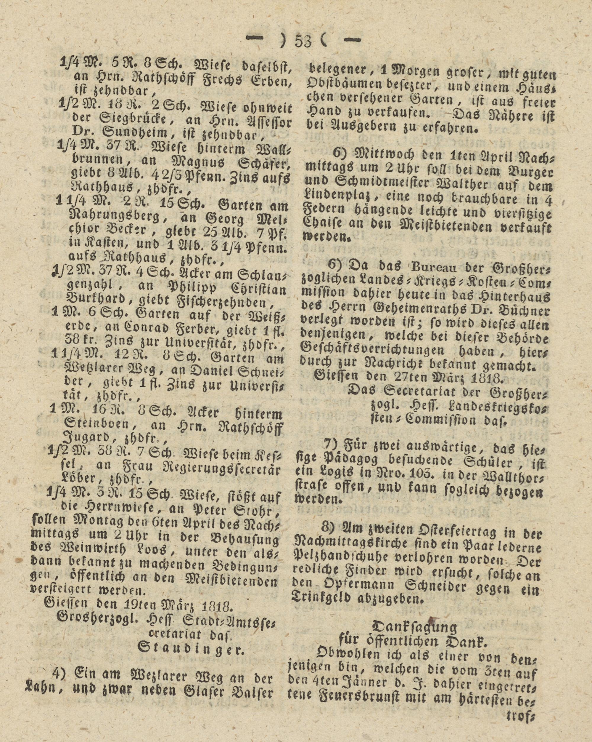 Giessen den 19ten Marz 1818. ' Grosherzogl. Hess Etadt-Anttsse- oretariat das.