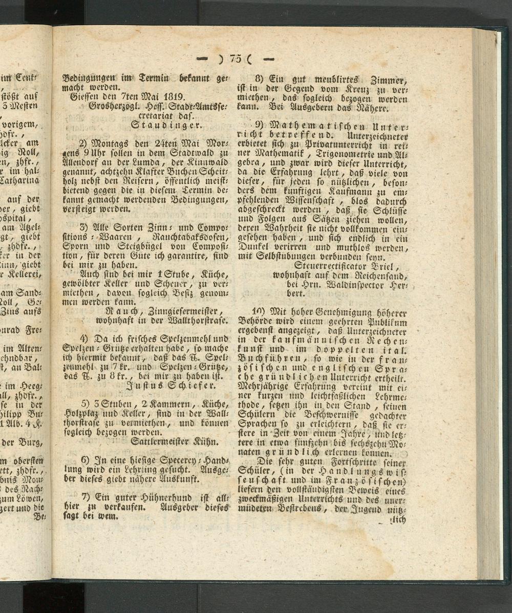 9) Math em a t isch en Unke r- rn cht bet re ffe n d. Unterzeichneter erbietet sich zu Privatunterricht in reiner Mathematik , Trigonometrie und Algebra , und zwar wird dieser Unterricht, da die Erfahrung lehrt, daß viele von dieser, für jeden so nützlichen, besonders dem künftigen Kaufmann zu empfehlenden Wissenschaft , blos dadurch abgeschreckt werden, daß sie Schlüsse und Folgen aus Sätzen ziehen wollen, deren Wahrheit sie nicht vollkommen ein.' gesehen haben, und sich endlich in ein Dunkel verirren und muthlos werden, mit Selbstribmigen verbunden seyn.