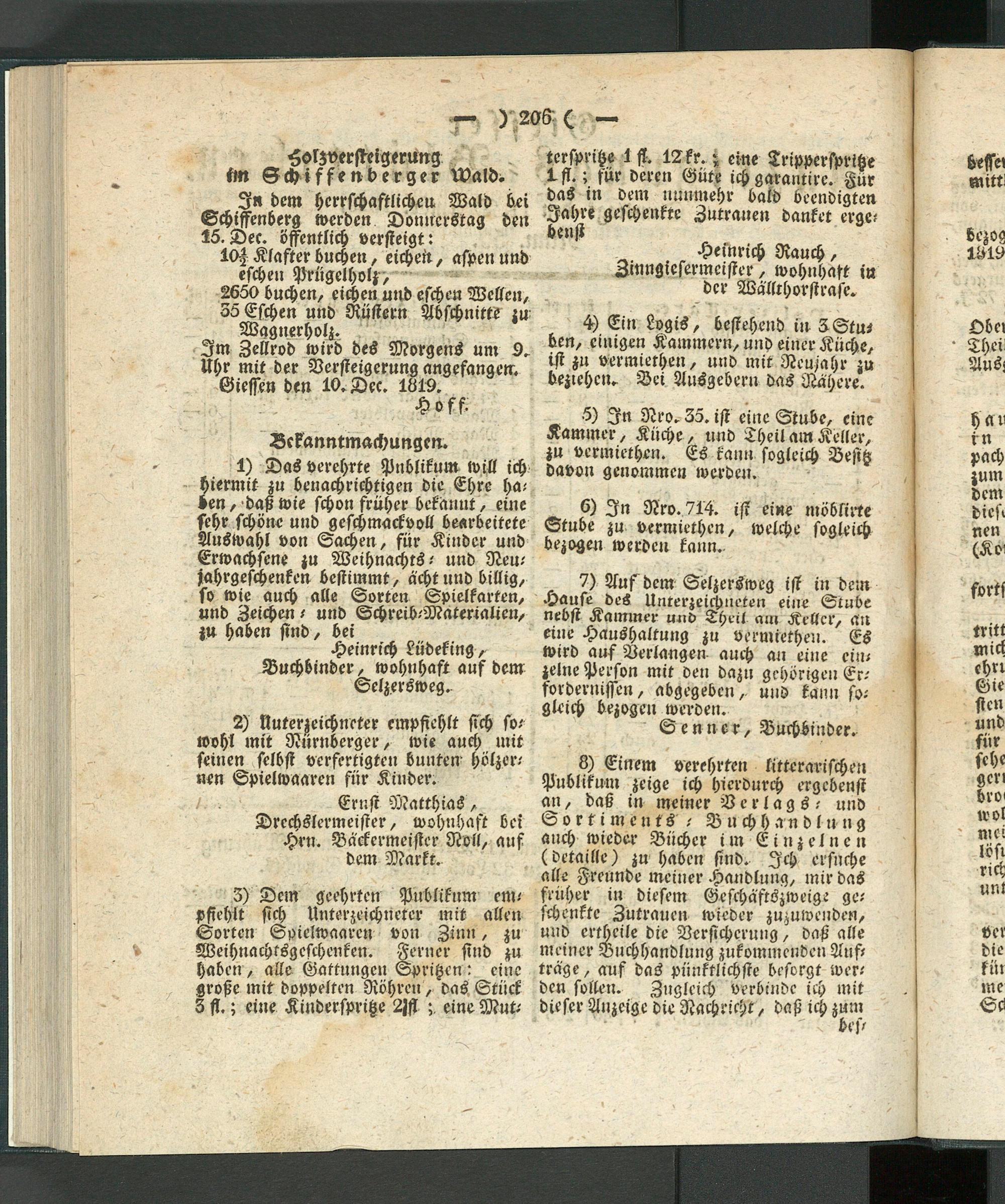 1) Das verehrte Publikum will ich hiermit zu benachrichtigen die Ehre haben, daß wie schon früher bekannt, eine sehr schöne und geschmackvoll bearbeitete Auswahl von Sachen, für Kinder und Erwachsene zu Weihnachts- und Neu- jahrgeschenken bestimmt, ächt und billig, so wie auch alle Sorten Spielkarten, und Zeichen - und Schreib-Materialien, iU haben sind, bei