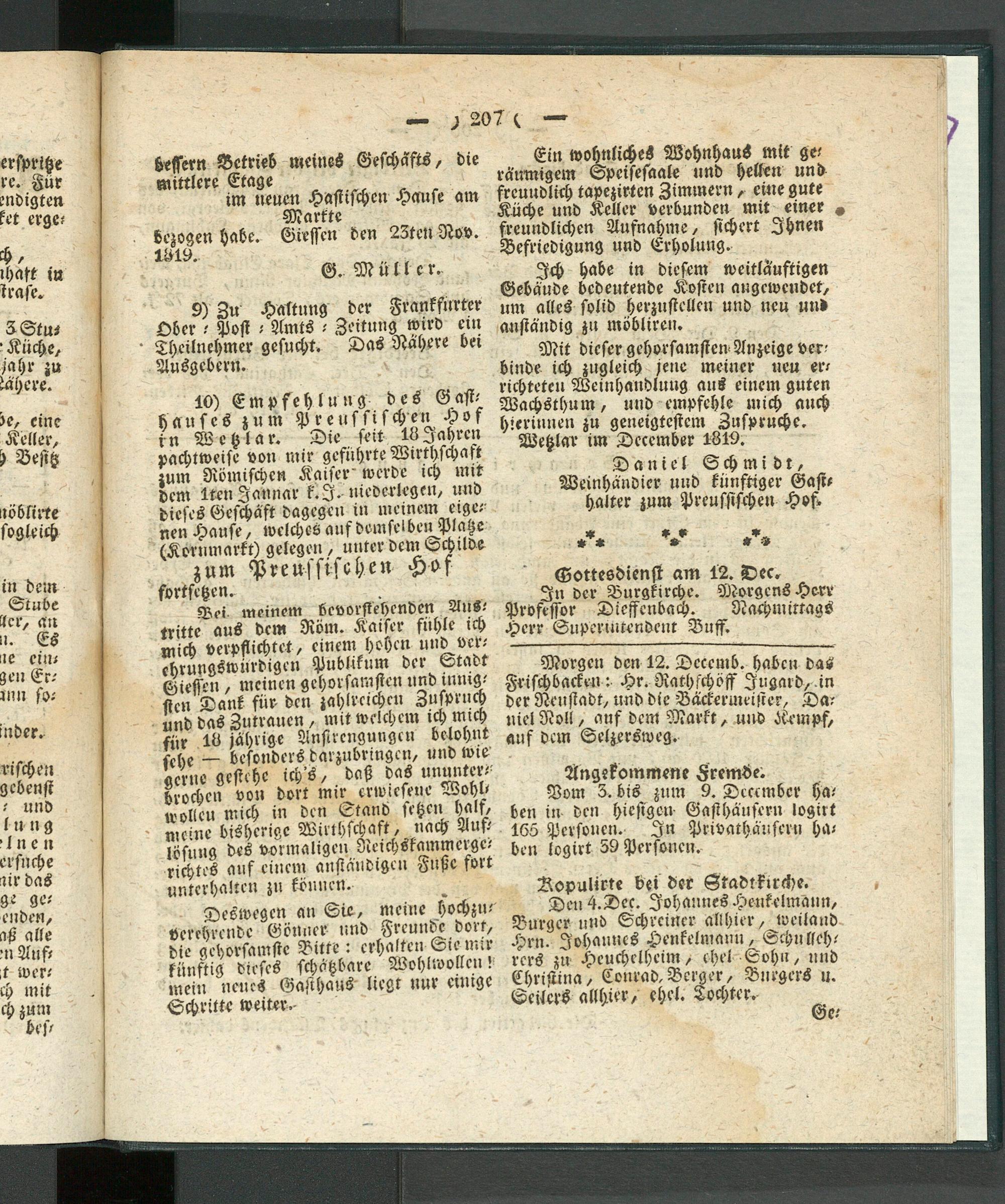 Boi meinem bevorstehenden Austritte aus dem Röm. Kaiser fühle ich mich verpflichtet, einem hohen und verehrungswürdigen Publikum der Stadt Giessen , meinen gehorsamsten und lnmg- sten Dank für- den zahlreichen Zuspruch und das Zutrauen , mit welchem ich mich für 18 jährige Anstrengungen belohnt — besonders darzubringcn, und wie gerne gestehe ich's, daß das ununterbrochen von dort mir erwiesene Wohl- tv»Heu mich in den Stand setzen Hals, meine bisherige Wirthschaft, nach Anf- löümg des vormaligen Neichskammerge- richtes auf einem anstäiidigen Huße fort unterhalten zu können.