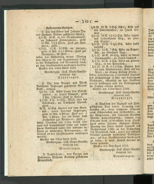 Weg, in der Psauulach, 1/2M. 21 R. 61,2 Sch. Garten hinter dem Wallbrunneu, stößt auf die Wiese, mi Georg Philipp König, sollen Dienstag deir 27ten dieses Monats des Nachmittags 2. Uhr auf dahiesigem Rathhaus, öffentlich air den Meistbie- tenden versteigert und die Bedingungen im Termin erofnet werden.