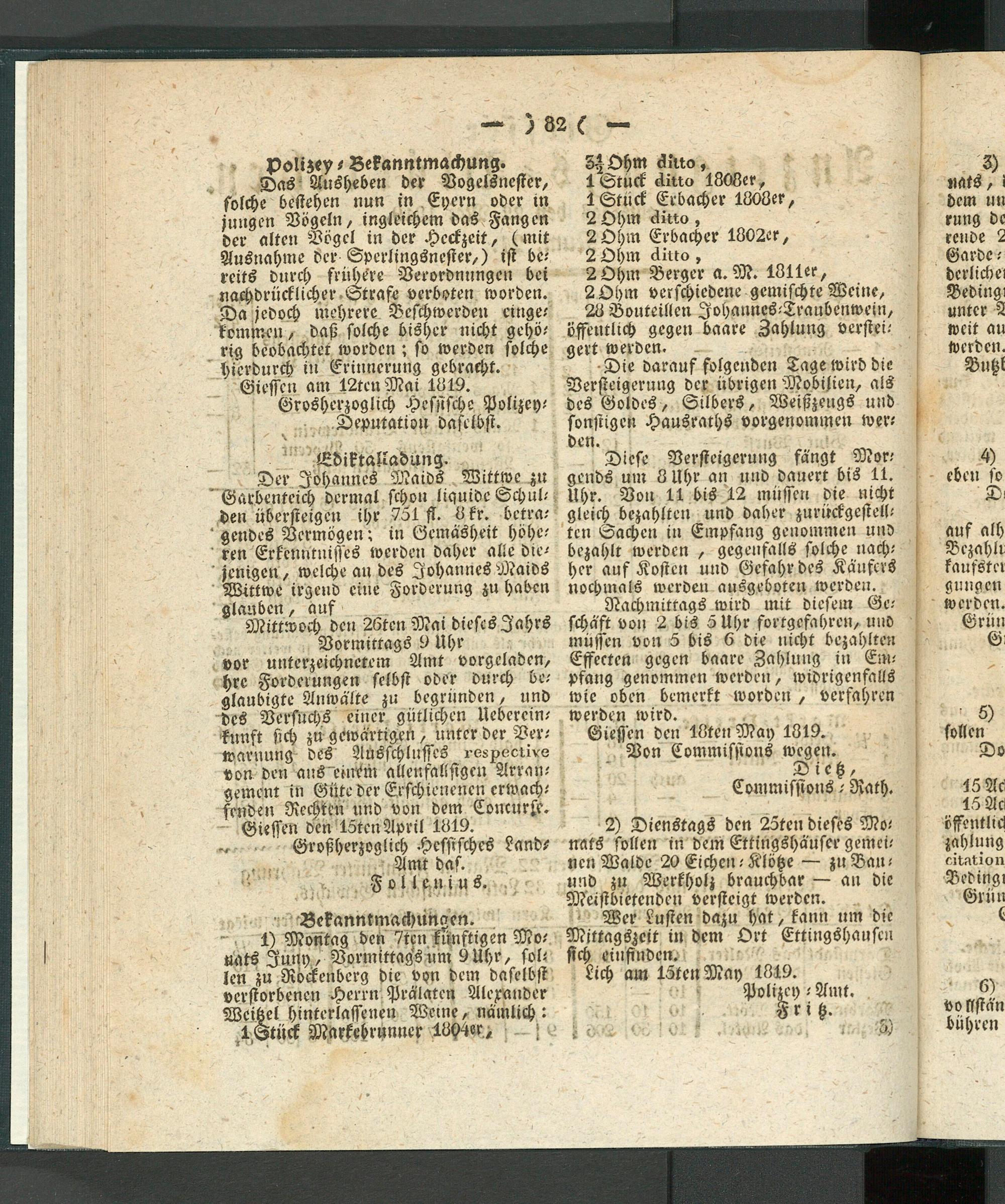 Das Ausheben der Vogelsnester, solche bestehen nun in Eyern oder in jungen Vögeln, ingleichem das Fangen der alten Vögel in der Heckzeit, (mit Ausnahme der Sperlingsnester,) ist bereits durch frühere Verordnungen bei nachdrücklicher Strafe verboten worden. Da jedoch mehrere Beschwerden eingekommen , daß solche bisher nicht gehörig beobachtet worden; so werden solche hierdurch in Erinnerung gebracht.
