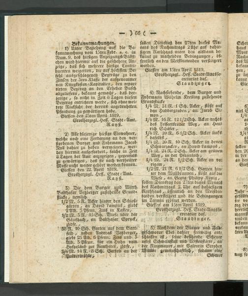 1/2M. 21 R. 61/2 Sch. Garten hinter dem Wallbrunnen, stößt anfdie Wiese, an. Georg Philipp König, sollen Dienstag den 27teil dieses Monats des Nachmittags 2. Uhr auf dahiesigem Rathhaus, öffentlich an den Meistbietenden versteigert und die Bedingungeu im Termin eröfnet werden.