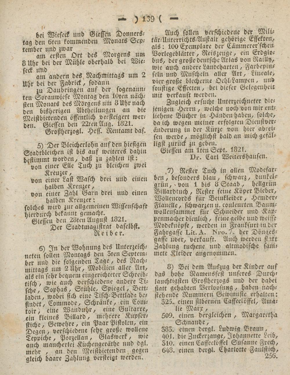 zu Danbringeu auf der sogenann/ tett Sorauwiese Montag den loten nach/ ftett Monats des Morgens um 3 Uhr nach den bisheriaen Abtherlungen an die Meistbietenden öffentlich versteigert wer/ den. Giessen den 22tenAng. 1821.
