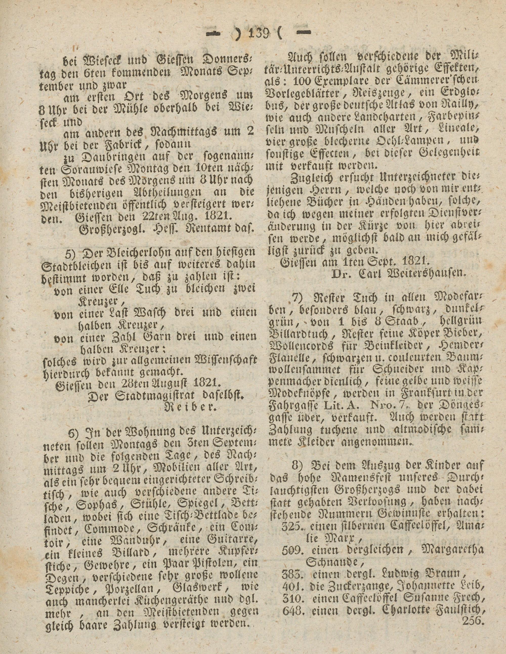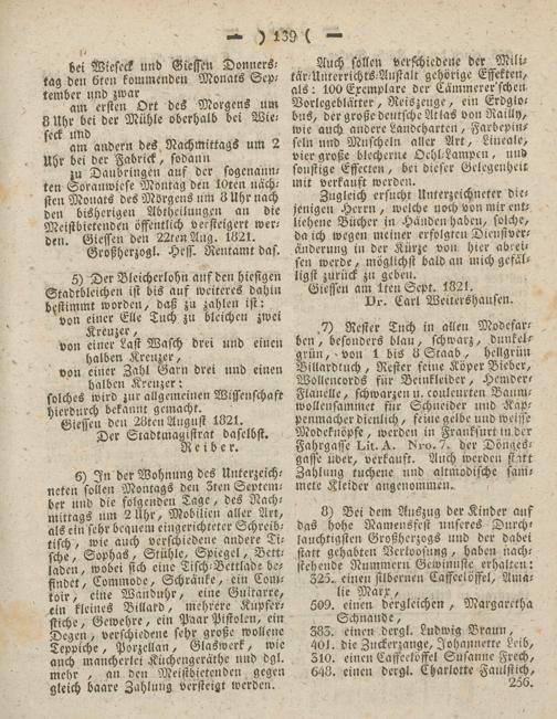 6) In der Wohnnng des Unterzeich/ tiefen sollen Montags den Sten Septem/ der und die folgenden Tage, des Nach/ mittags nm 2 Uhr, Mobilien aller Art, als ein sehr bequem eingerichteter Schreib/ tisch / wie auch verschiedene andere Li/ sche, Sophas, Stühle, Spiegel, Bett/ laden, wobei sich eine Tisch-Bettlade befindet, Commode, Schränke, ein Com/ toir, eine Wanduhr, eine Guitarre, ein kleines Billard, mehrere Kupferstiche, Gewehre, ein Paar Pistolen, em Degen, verschiedene sehr große wollene Teppiche, Porzellan, Glaswerk, wre auch mancherlei Küchengerathe und dgl. mehr , an den Meistbietenden gegen gleich baare Zahlung versteigt werden.