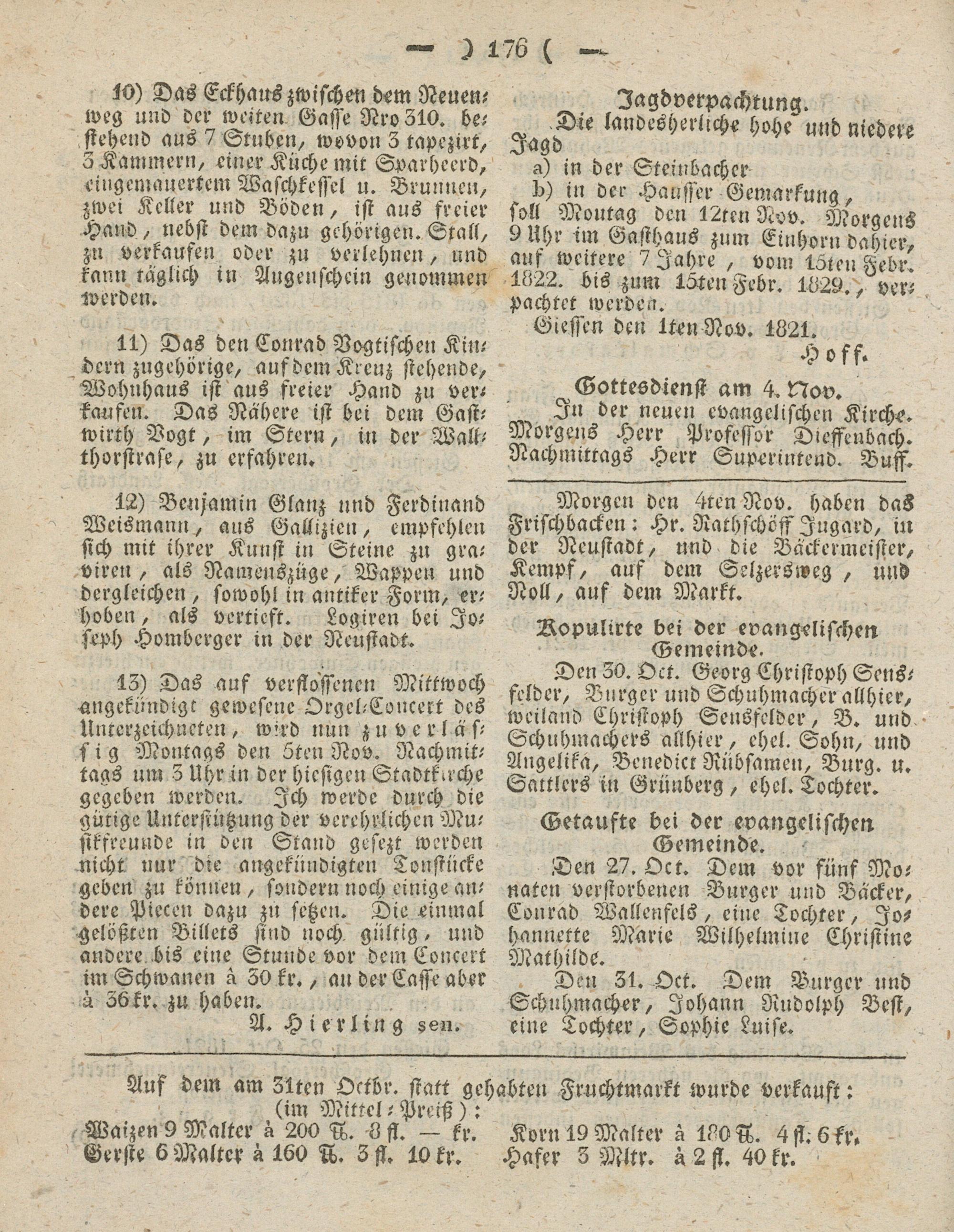 b) in der Hausser Gemarkung, soll Montag den 12kk»Nov. Morgens 9 Uhr im Gasthaus zum Einhorn dahier, auf weitere 7 Jahre , vom 15ten Febr. 1822. bis zum löten Febr. 1829., verpachtet werden.