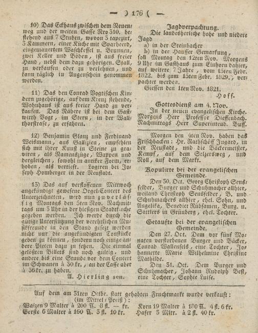 Korn 19 Malter ä 180 T. 4 st. 6 fr, Hafer 3 Mltr. ä 2 st. 40 fr.