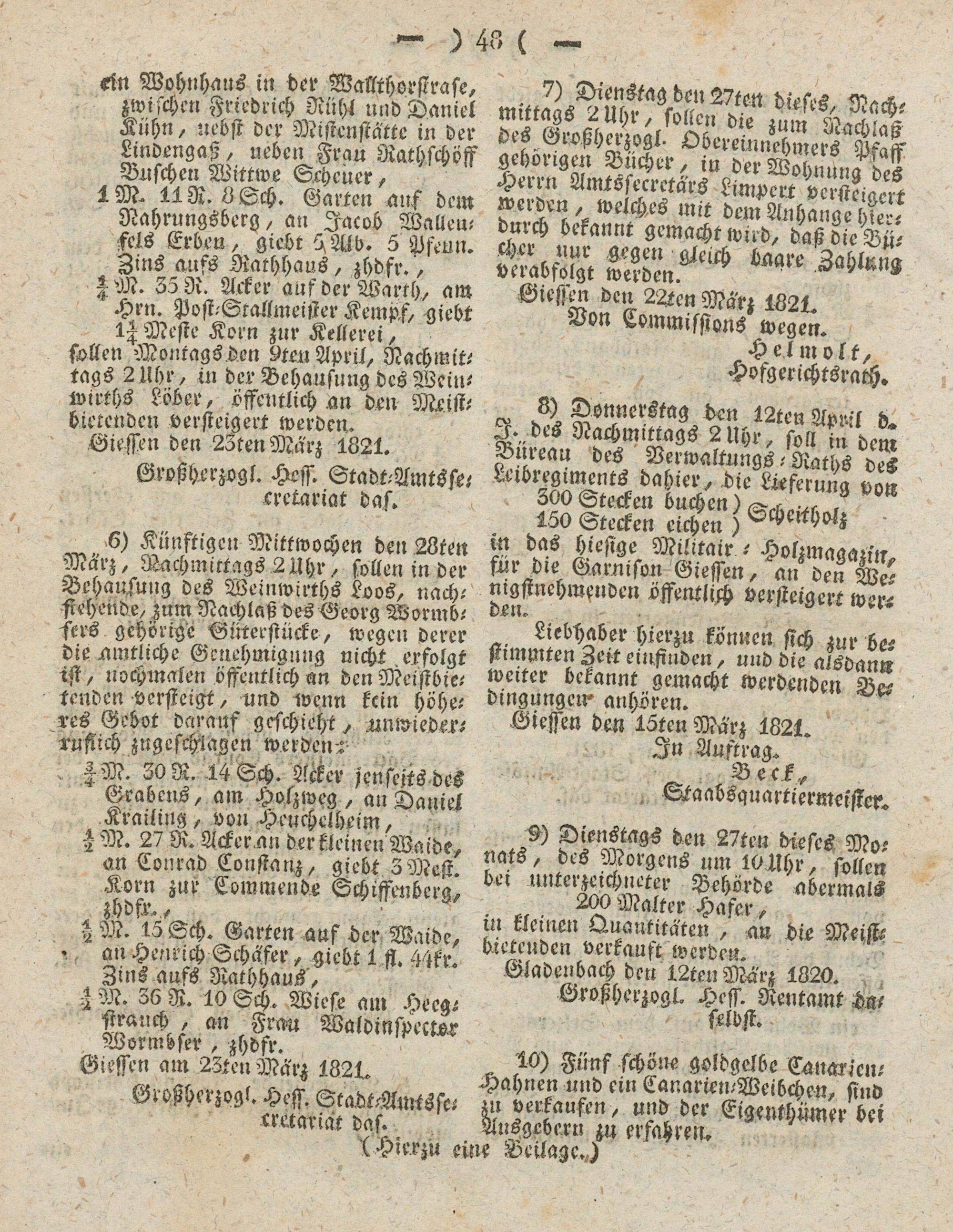 6) Künftigen Mittwochen den 28ten Marz, Nachmittags 2Uhr, sollen in der Behausung des Weinwirths Loos, nachstehende, zum Nachlaß des Georg Wormb- sers gehörige Gr'ttersiücke, wegen derer die amtliche Genehmigung nicht erfolgt Ist, nochmalen öffentlich an den Meistbietenden versteigt, und wenn kein höheres Gebot darauf geschieht, unwieder- ruflich zugeschlagen werdens