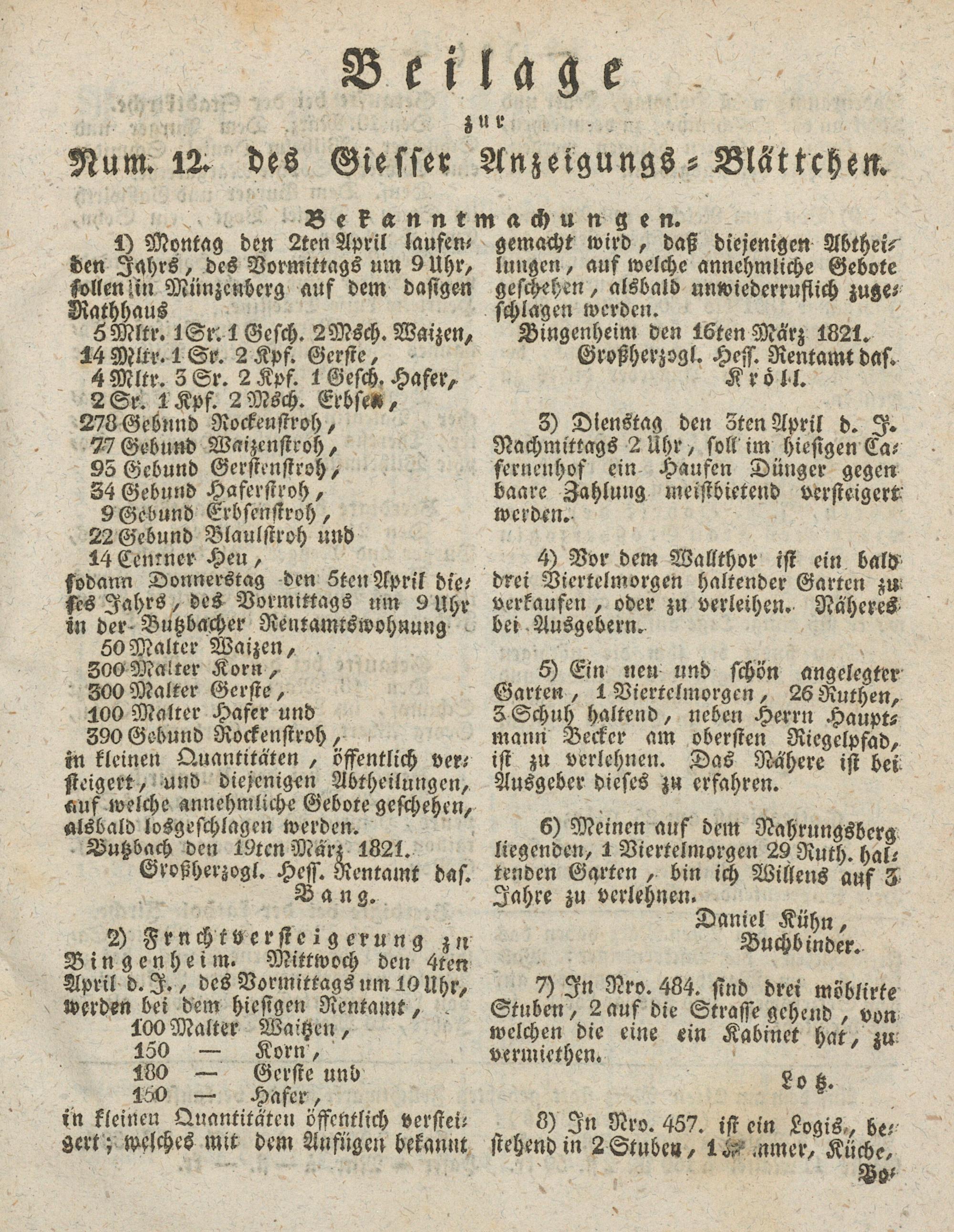 2) Frnchtversteigerung zu Bingenheim. Mittwoch den 4ten April d. I., des Vormittags nm 10 Uhr, werden bei dem hiesigen Rentamt, .