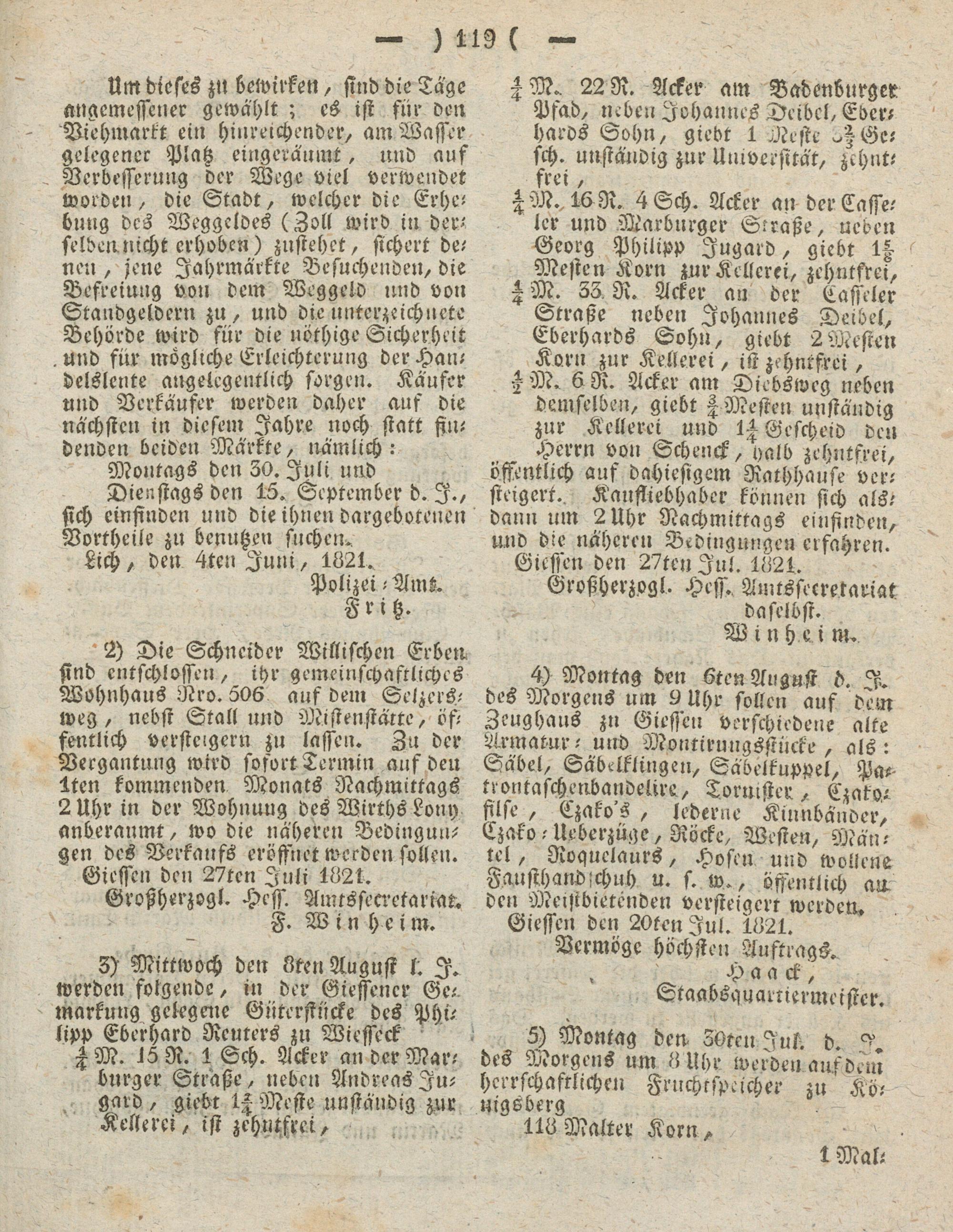 4) Montag den 6ten August b. I. des Morgens um 9 Uhr solle» auf dem Zeughaus zn Giesse» verschiedene alte Armatur- uud Montiruugsstücke, als: Säbel, Säbelklinge», Säbelkuppel, Pa-- trontaschenbandeiire, Tonnster, Czako- filse, Czako's, lederne Kinnbänder, Czako -Upberzüge, Röcke, Weste», Mäntel , Roguelaurs, Hosen und wollene Fausthandschuh u. s. w., öffentlich an de» Meistbietenden versteigert werden. Giesse» de» 20te»Jul. 1821.