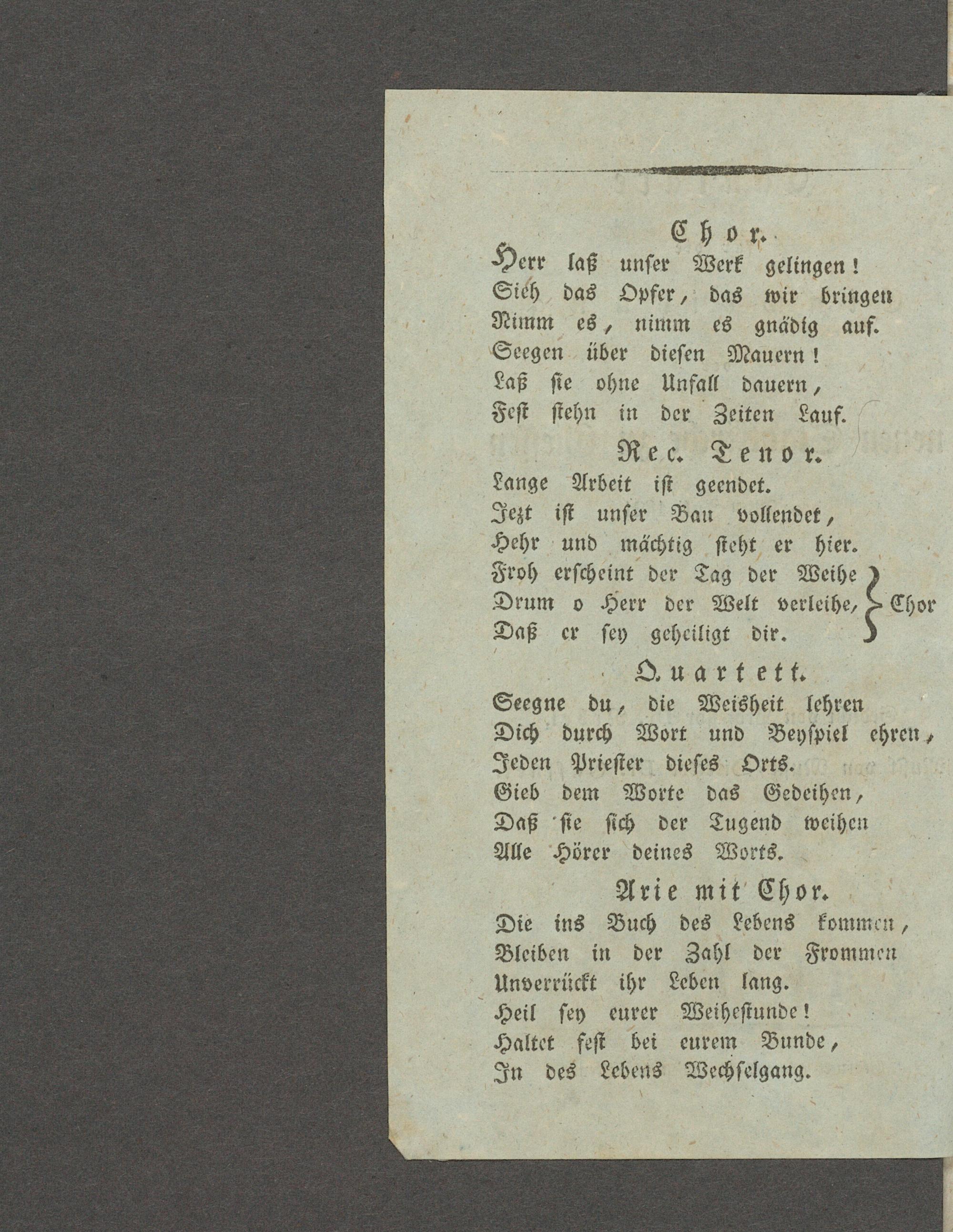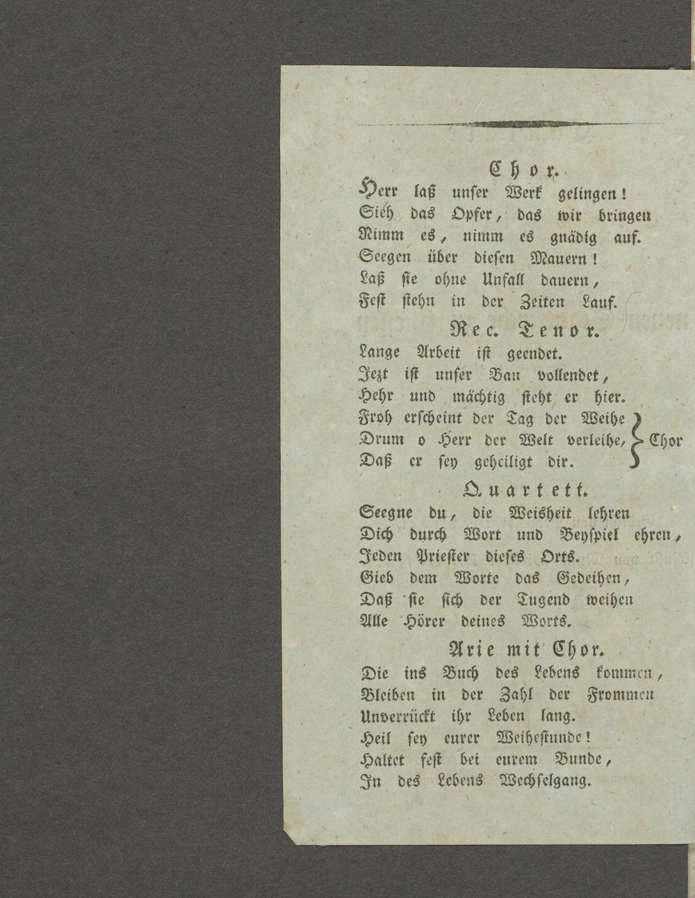 Cho» 'Perr laß unser Werk gelingen! Sieh das Opfer, das wir bringen Nimm es, nimm es gnädig auf. Seegen über diesen Mauern!