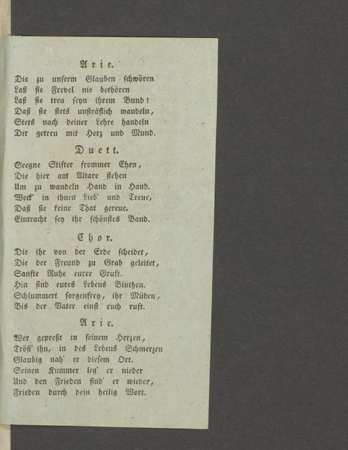 Die zu unferm Glauben schwören Laß sie Frevel nie bethören Laß sie treu seyu ihrem Bund! Daß sie stets unsträflich wandeln. Stets nach deiner Lehre handeln Dir getreu mit Herz und Mund.