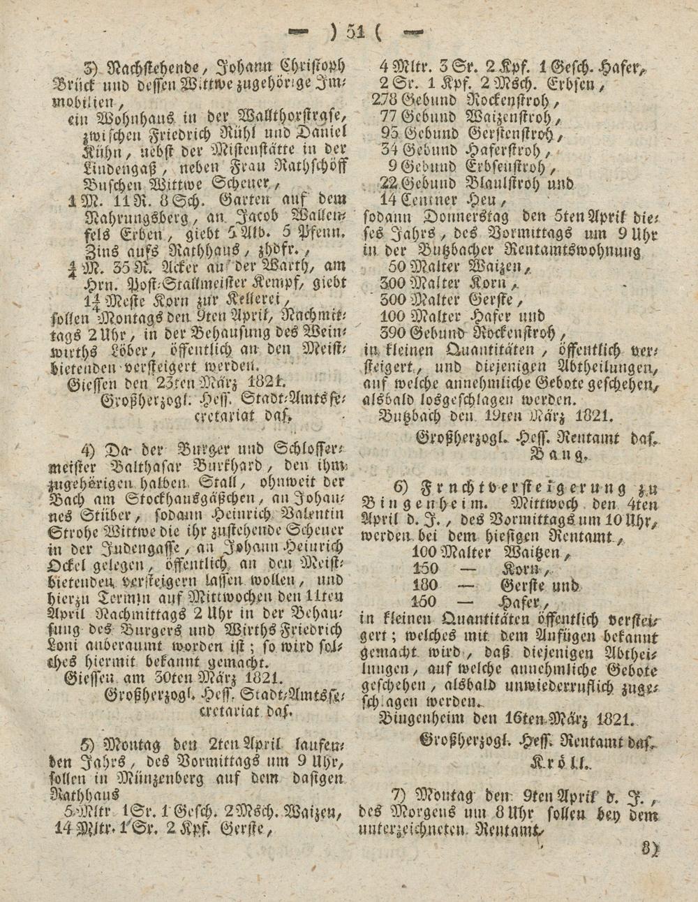 6) Frucht Versteigerung zu Bingenheim. Mittwoch den 4ten April d. I., des Vormittags um 10 Uhr, werden bei dem hiesigen Rentamt ,