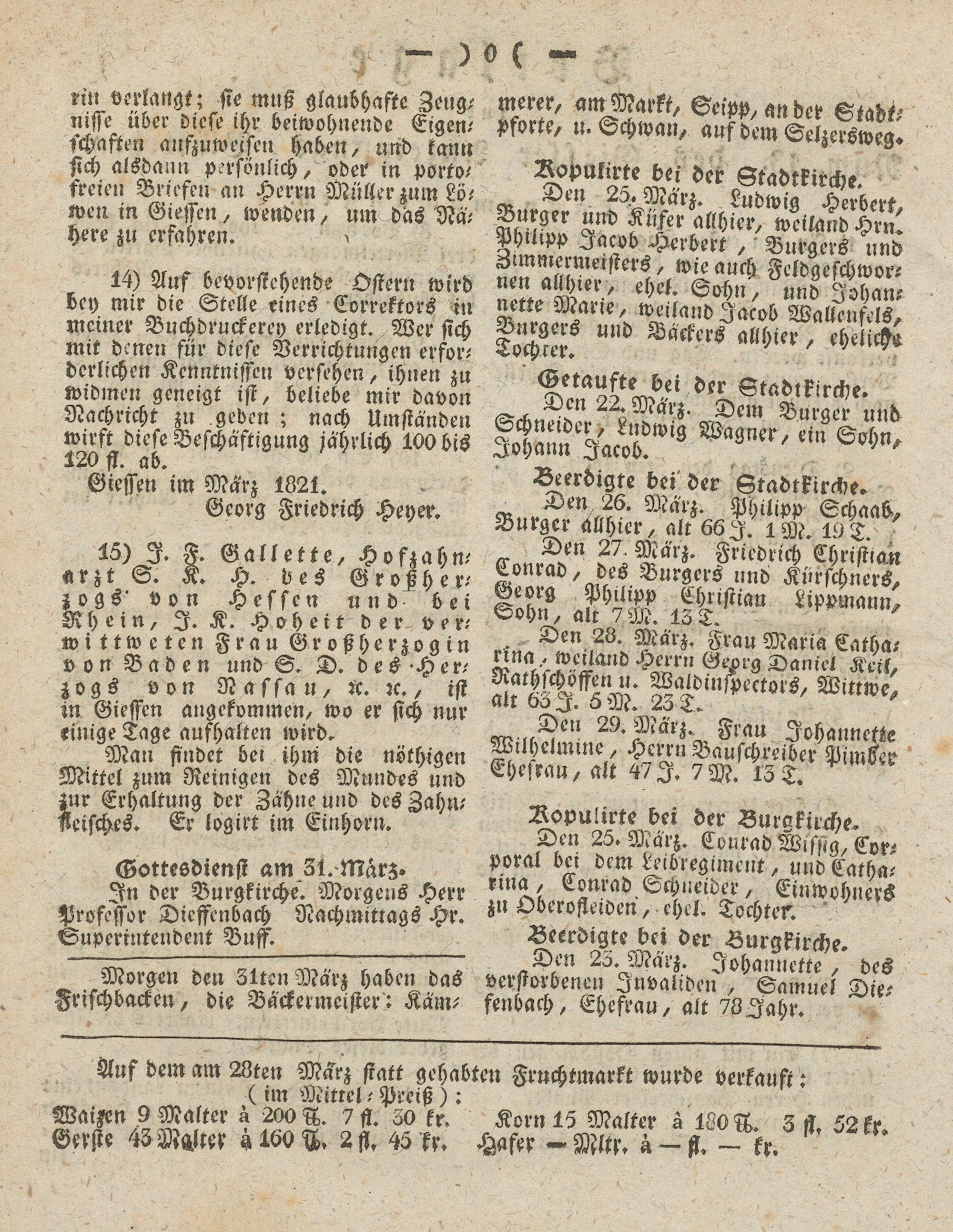 14) Auf bevorstehende Ostern wird bcy mir die Stelle eines Correktors m meiner Buchdruckern) erledigt. Wer sich mit denen für diese Verrichtungen erforderlichen Kenntnissen versehen, ihnen zu widmen geneigt ist, beliebe mir davon Nachricht zu geben; nach Umständen wirft diese Beschäftigung jährlich 100 bis 120 fl. ab.