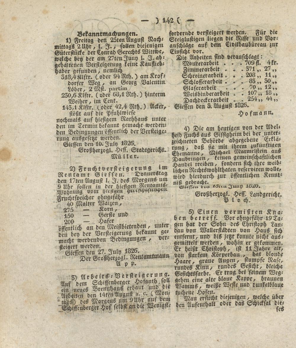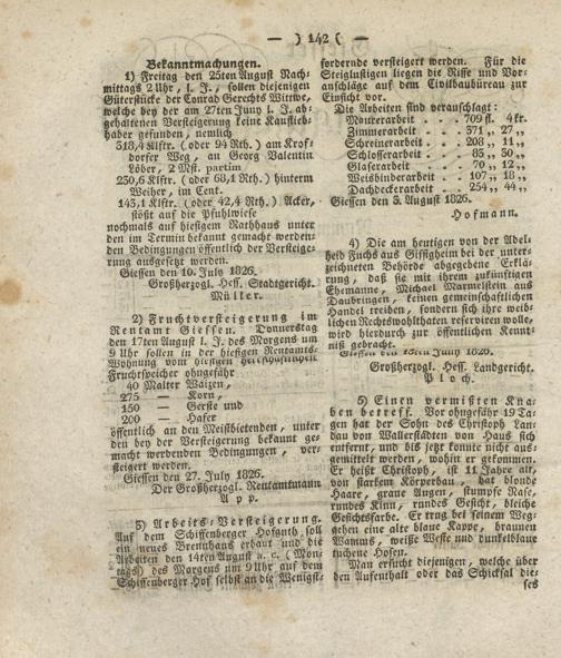 Giessen den 10. July 1826, Eroßherzogl. Hess. Stadtgericht.