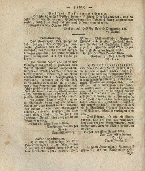 Das Großherzogl. Hess. Hofgericht dahier hat gegen den Großherzogl. Rittmeister Freiherrn von Buseck, zu Al- renbuseck, den Concurs erkannt und sich bewogen gefunden, den Unterzeichneten zum Commissarius in dieser Sache zu bestellen.