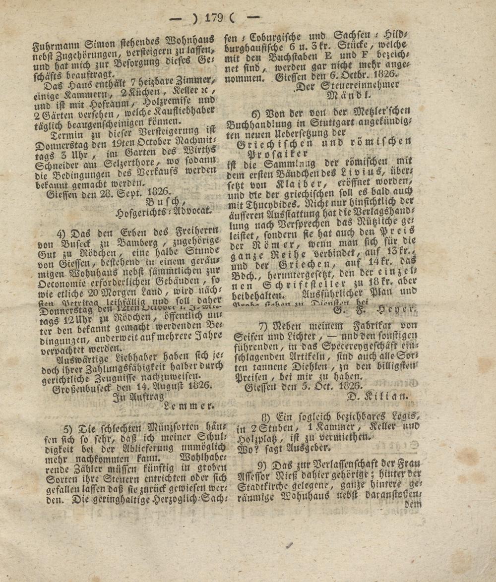 sen f Cobnrgische und Sachsen - Hild- burghausische 6 «. 3 fr. Stucke, welche mit den Buchstaben B und B bezeichnet sind, werden gar nicht mehr angenommen. Giessen den 6. Octbr. 1826.