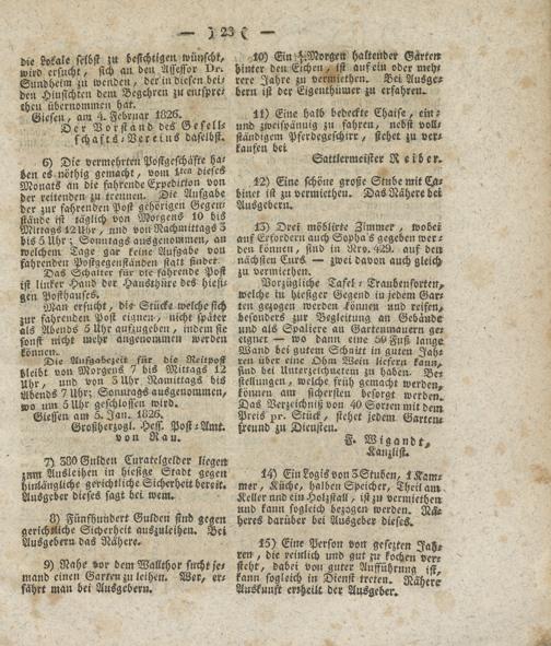 14) Ein Logis von 3 Stuben, 1 Kammer, Küche, halben Speicher, Theil am. Keller und ein Holzstall, ist zu vermietheu und kann sogleich bezogen werden. Näheres darüber bei Ausgeber dieses.