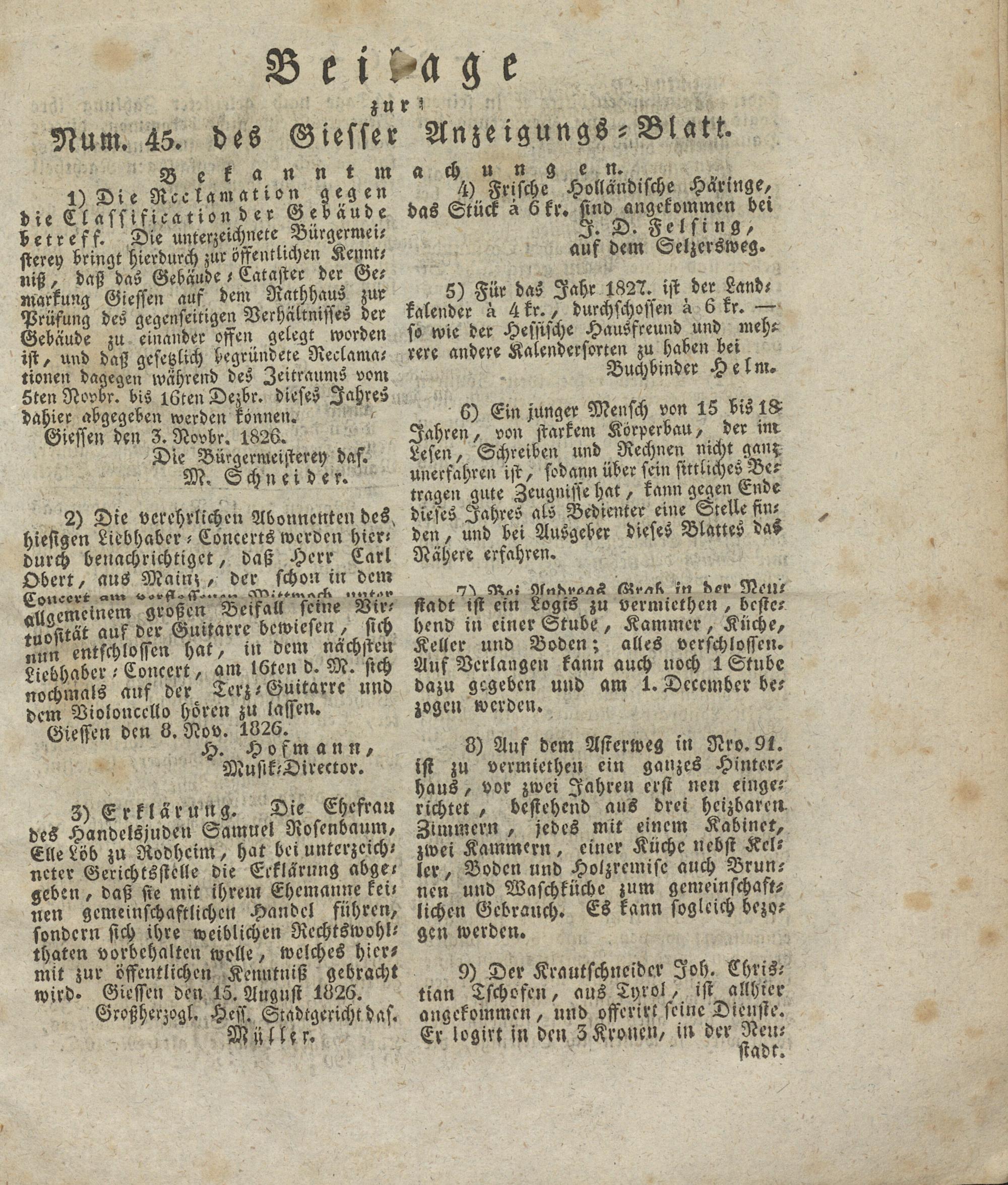 1) Die Ncclamation gegen die Classification der Gebäude betreff. Die unterzeichnete Burgermer- sterey bringt hierdurch zur öffentlichen Kennt/ niß, daß das Gebäude, Cataster der Gemarkung Giessen auf dem RathhauS zur Prüfung des gegenseitigen Verhältnisses der Gebäude zu einander offen gelegt worden ist, und daß gesetzlich begründete Neclama, tionen dagegen wahrend des Zeitraums vom Lten Novbr. bis 16teu Dezbr. dieses Jahres dahier abgegeben werden rönnen. -/