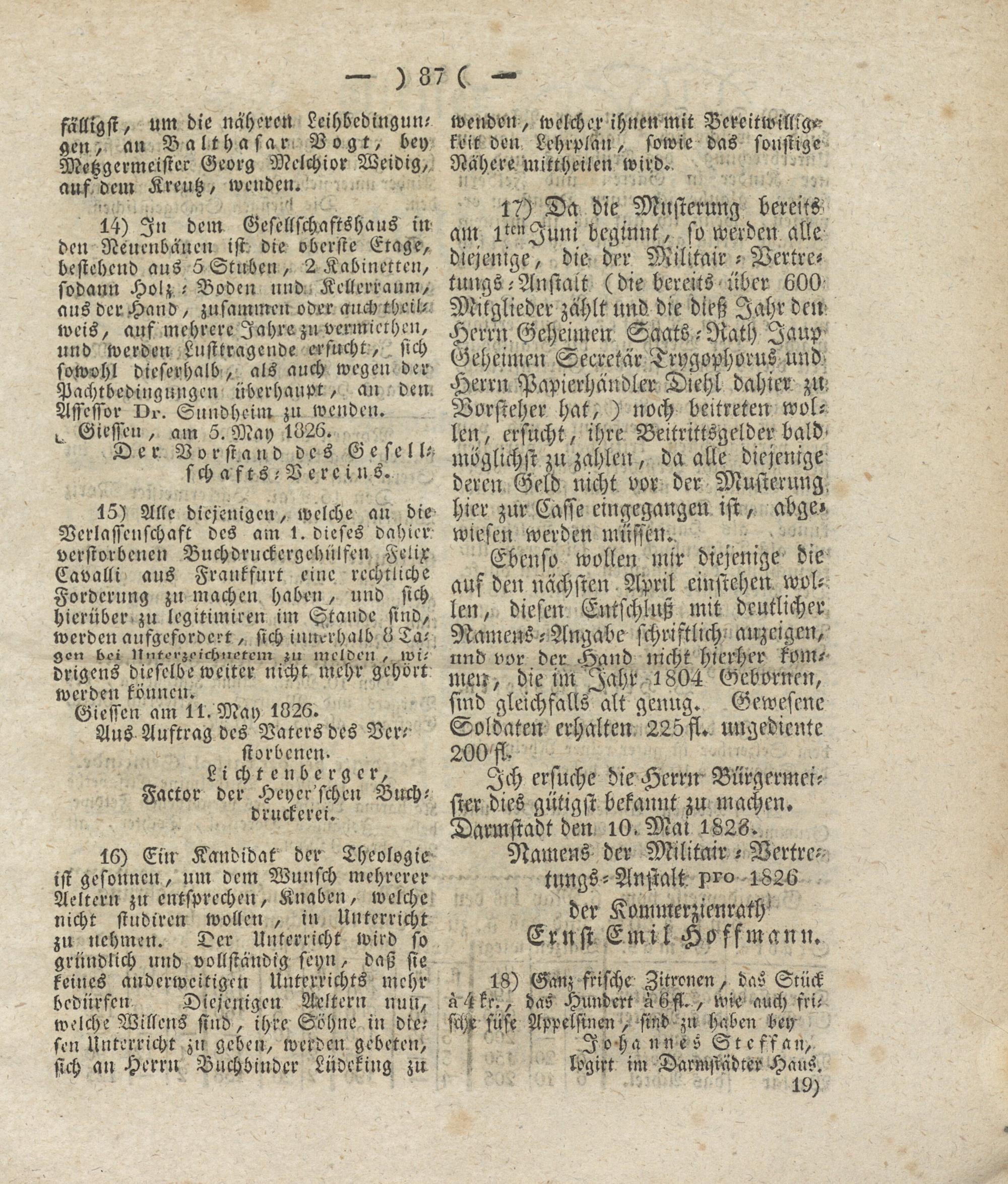 17) Da die Musterung bereits am ikcnJuni beginnt, so werden alle diejenige, die- der Militair - Vertretungs-Anstalt (die bereits über 600 Mitglieder zahlt und die dieß Jahr den Herrn Geheimen Saats - Rath Jaup Geheimen Secretär Trygophorus und. Herrn Papierhändler Diehl dahier zur Vorsteher hat, ) noch betreten wollen , ersucht, ihre Beitrittsgelder baldmöglichst zu zahlen, da alle diejenige deren Geld nicht vor der Musterung, hier zur Caste eingegangen ist, abge» wiesen werden müssen..