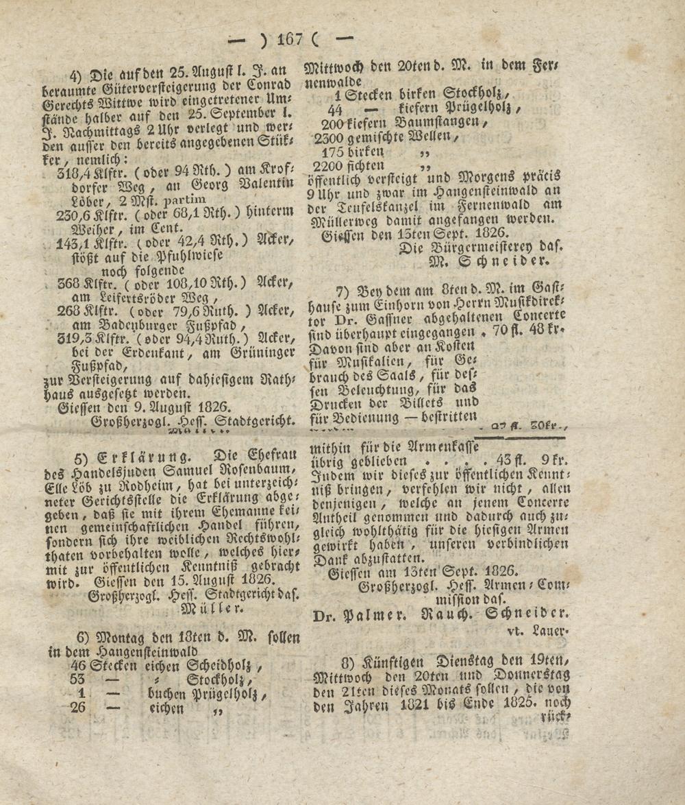 5) Erklärung. Die Ehefrau des Handelsjuden Samuel Rosenbaum, Elle Löb zu Rodheim, hat bei unterzelch- neter Gerichtsstelle die Erklärung abgegeben , daß sie mit ihrem Ehemaune ker, ticn gemeinschaftlichen Handel führen, sondern sich ihre weiblichen Rcchtswohl- Ihaten Vorbehalten wolle, welches hiermit zur öffentlichen Kenntniß gebracht wird. Giessen den 15. August 1826.