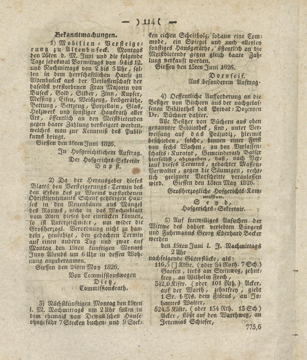 Alle Besitzer von Büchern aus oben genannter Bibliothek, sind, unter Verweisung auf das Präjudiz, hiermit beschieden, solche, binnen einer Frist von sechs Wochen, an den Verlaffen- schafts - Kurator, Gemeinderath Balser Hierselbst, abzugeben, daß, nach Verlauf dieses Termins, gedachter Massen- Verwalter, gegen die Säumigen, recht, lich geeignete Vorschritte veranlassen wird. Giessen den lÜtenMay 1826.