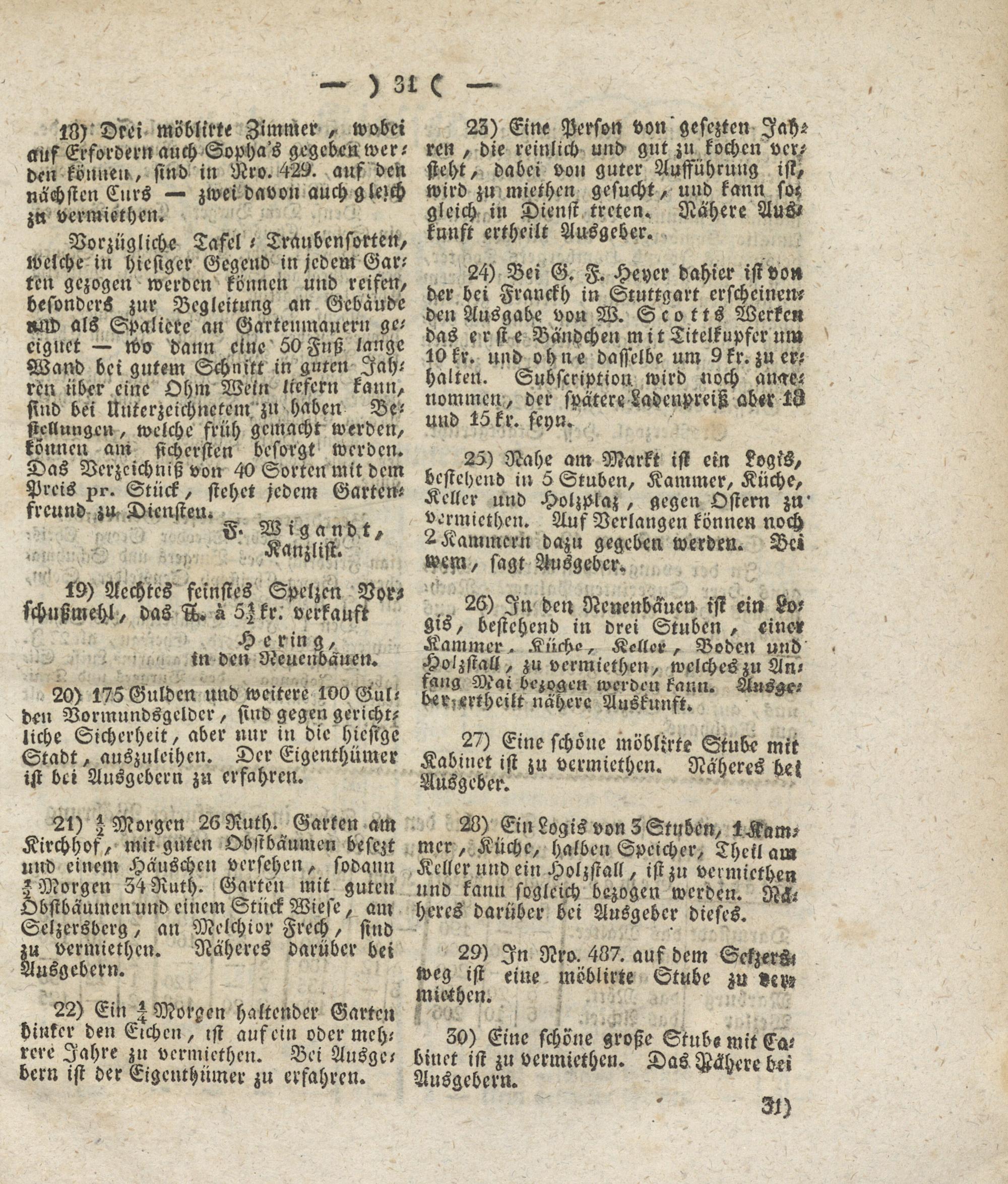 20) 175 Gulden und weitere 100 Gulden Vormundsgelder, sind gegen gerichtliche Sicherheit, aber nur in die hiesige Stadt, auszuleihen. Der Eigenthümer ist bei Ausgebern zu erfahren.