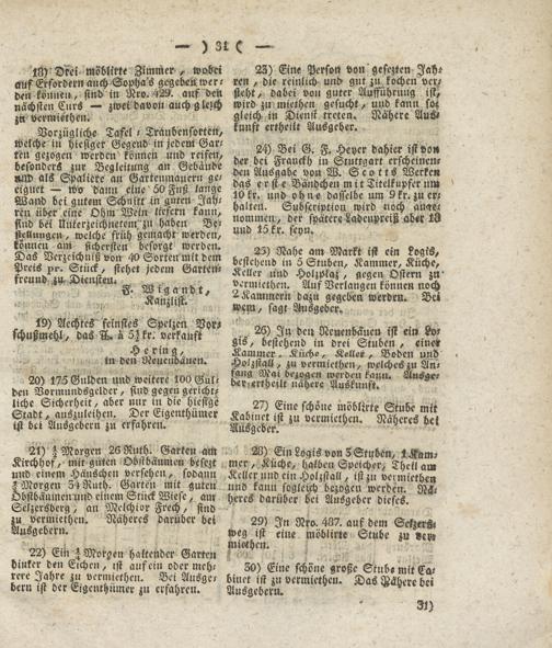 24) Bei G. F. Heyer dahier ist von der bei Franckh in Stuttgart erscheinen- den Ausgabe von W. Scotts Werken das erste Bänychen m i t Titelkupfer um 10kr. und ohne dasselbe um 9kr. zuen halten. Subscription wird noch anaer nominell;, der spätere Ladenpreiß aber 19 und 15 kr. feyn.
