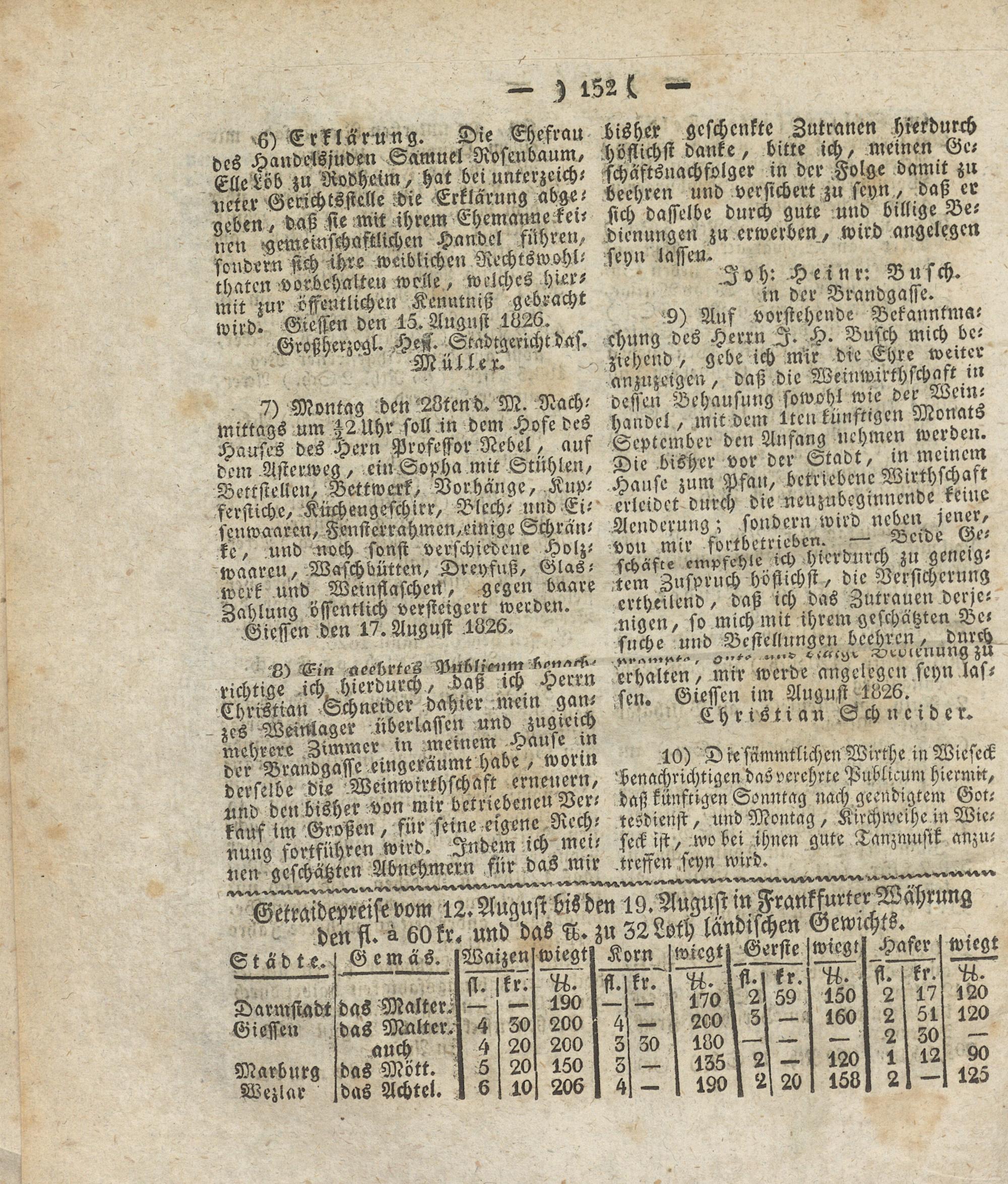 6) Erklärung. Die Ehefrau bisher^ geschenkte..Zutrauen hi-kburch des Hanbcl'sjuben Samuel 'Rosenbaum, Elle Löb zu Rvdheim, hat bei unterzeichneter Gerichtsstelle.die Erklärung abge- neben, daß sie mit ihrem Ehemanne keu nen aemeinschaftlichen Handel fuhren, sondern sich ihre weiblichen Nechtswohl- thaten vorbchaIteu weile , welches hUvf mit mr öffentlichen Kenutniß gebracht wird. Giessen den 15. August 1826.