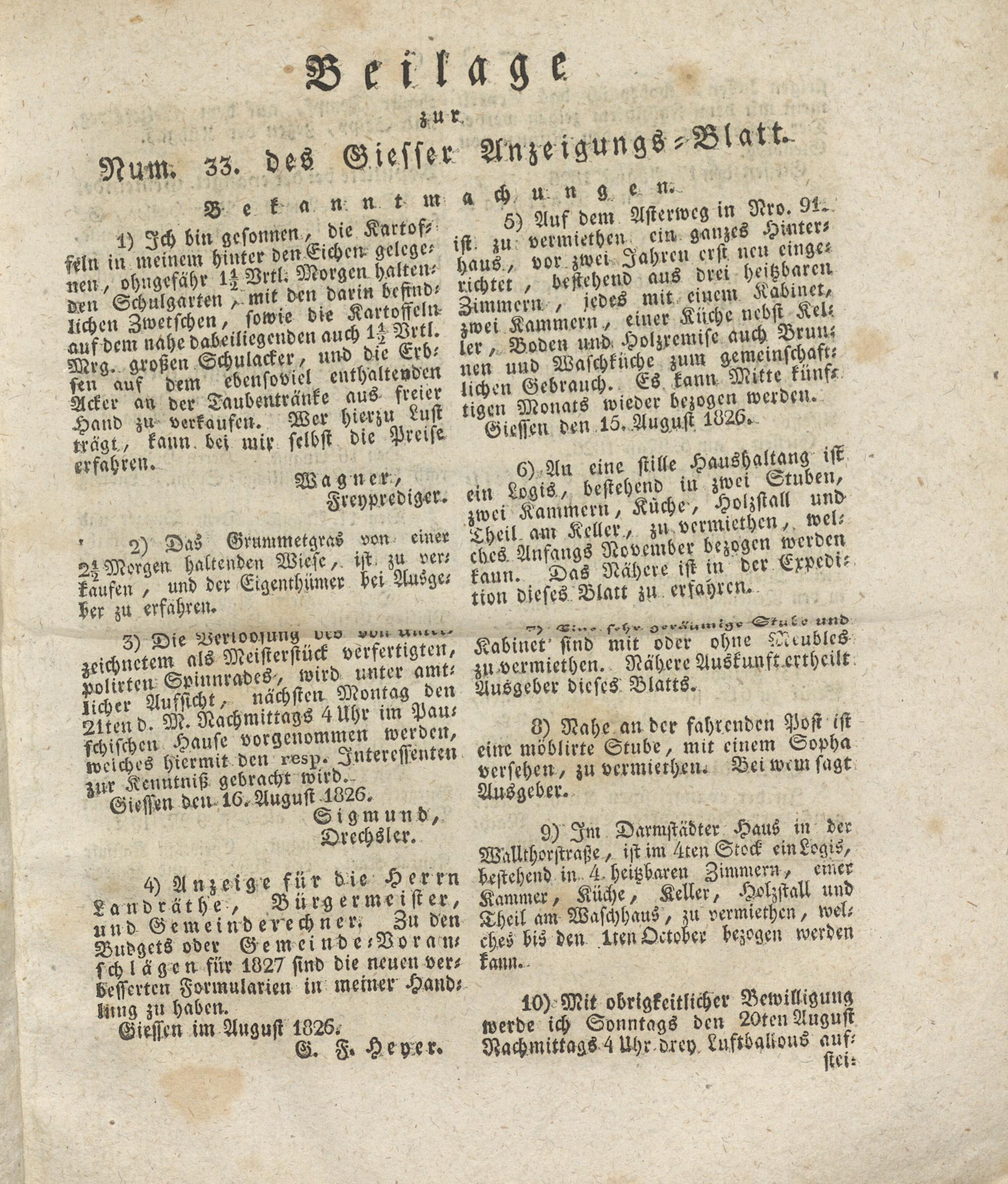 10) Mit obrigkeitlicher Bewilligung werde ich Sonntags den 20ten August Nachmittags 4 Uhr drey Luftbaliouö mrst