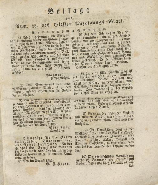 4) Anzeige für die Herrn L a n d r ä t h e , Bürgermeister, und Gemeind errechn er. Zu den Budgets oder Gemeinde-Voranschlagen für 1827 sind die neuen verbesserten Formularien in meiner Handlung zu haben.
