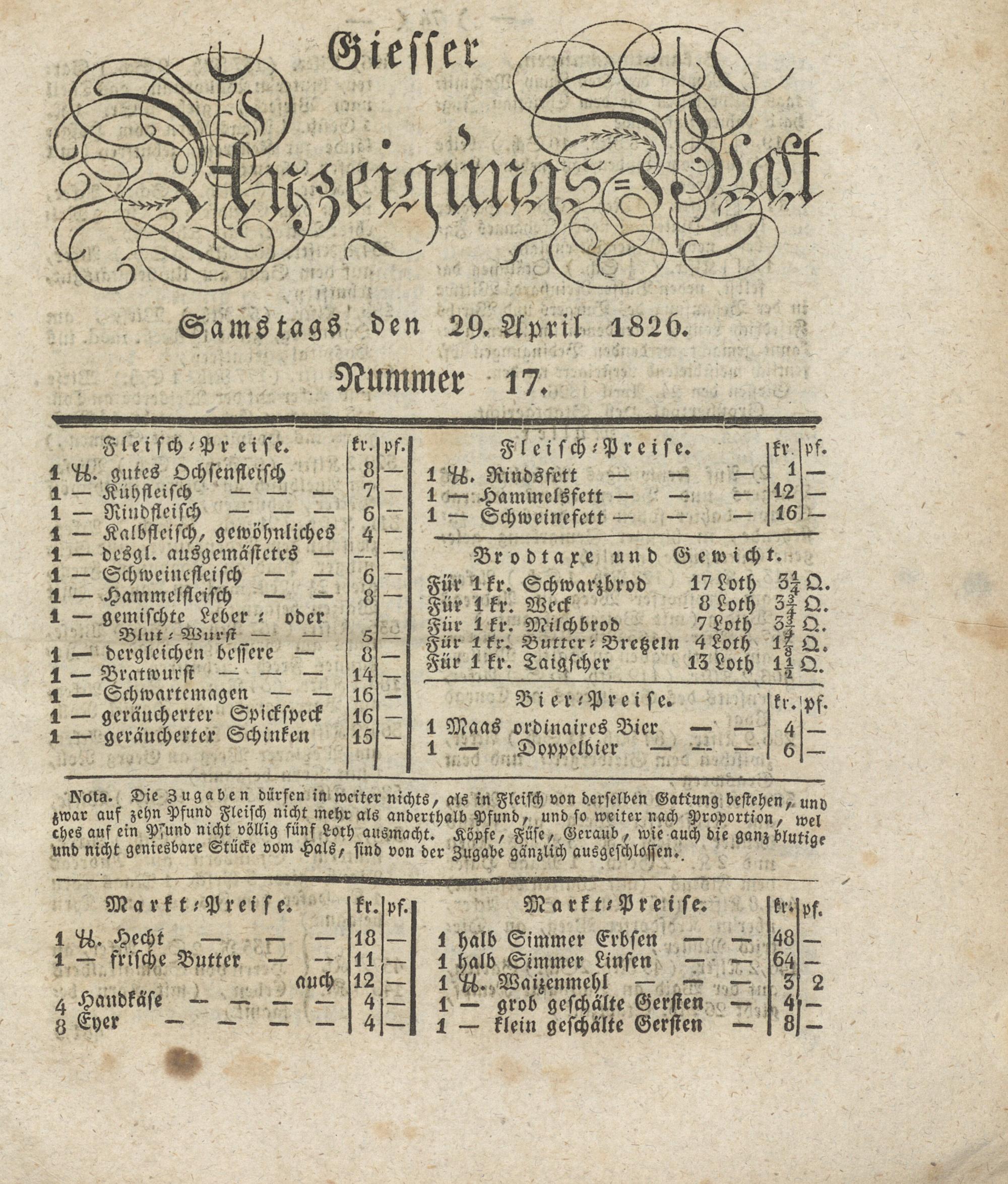 Samstags den 29. April 1826.